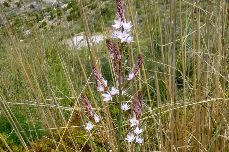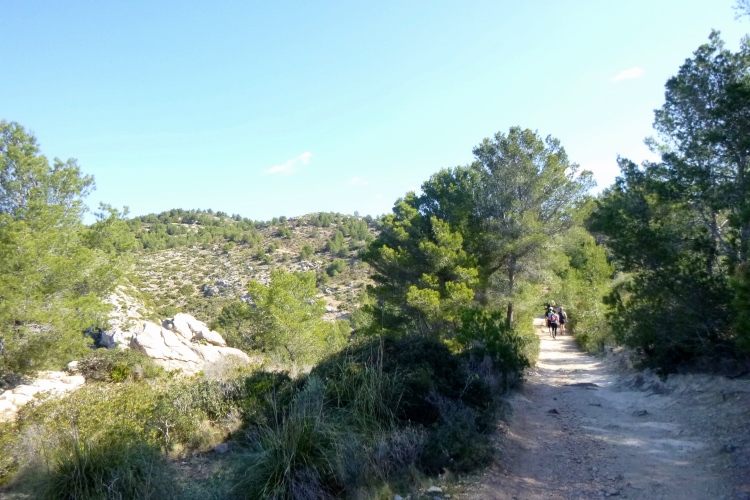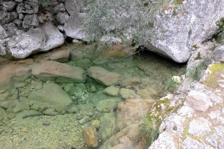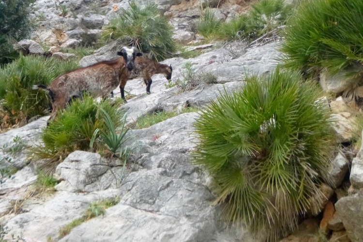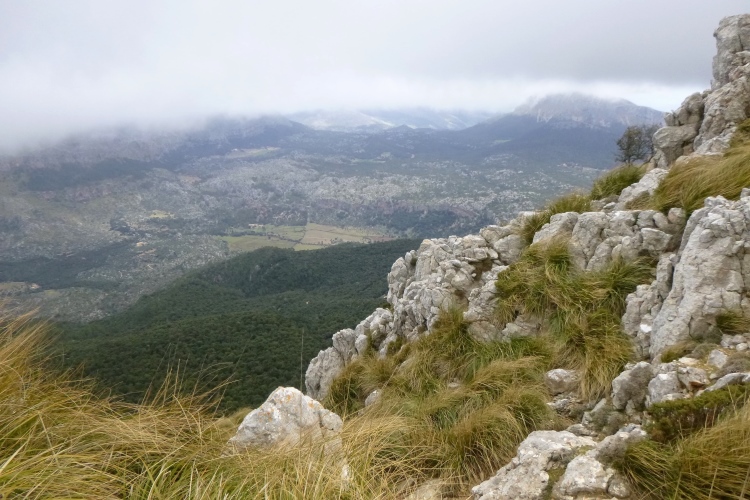 Nach den 12 km tut ein Bierchen wieder ganz gut. Entlang einer Llegada, einer Wasserleitung, führt uns der Weg weiter. Links blinkt der See Gorg Blau in der Ferne, voraus beginnt ein zerklüfteter Olivenwald mit dem langen und stellenweise steilen Aufstieg zur Passhöhe (1200 hm). Es wird immer alpiner und der Sturm stärker. Mir bläst es den Schnott horizontal von der Nase weg. Frisch ist‘s auf der Sonneninsel. Also Langarmhemd drüber und und weiter. Deutsche Wanderer begegnen uns, aus Thüringen. Mit dem Rennsteig könne man das hier natürlich nicht zu vergleichen, es sei aber doch ganz nett. Auf der Passhöhe stehen Mauern, im Windschutz kann man verschnaufen. Lieber flott weiter, bergab in ein Tal und dann zum nächsten Pass hoch (1120 hm). Im Kalkstein hält sich nur das Gras, dazwischen ragen die nackten Felsen auf. Wie in den Alpen.