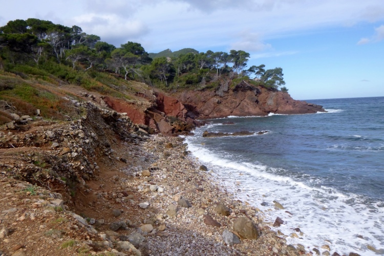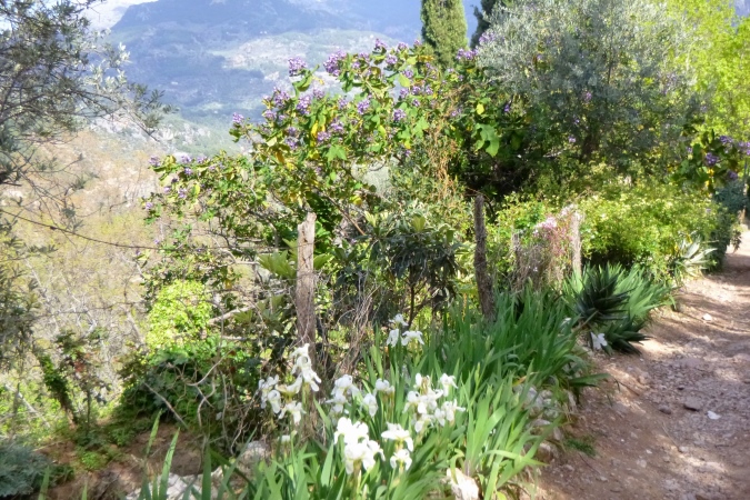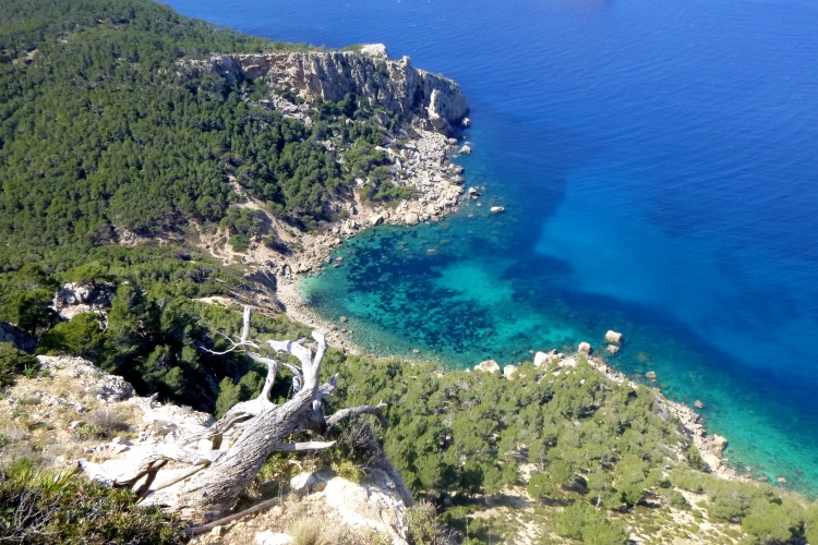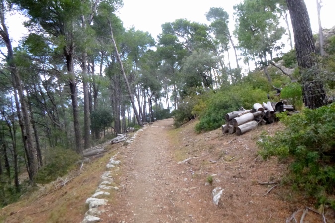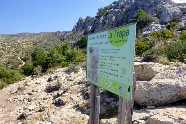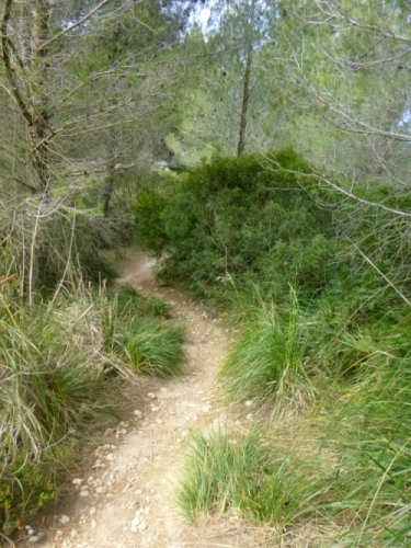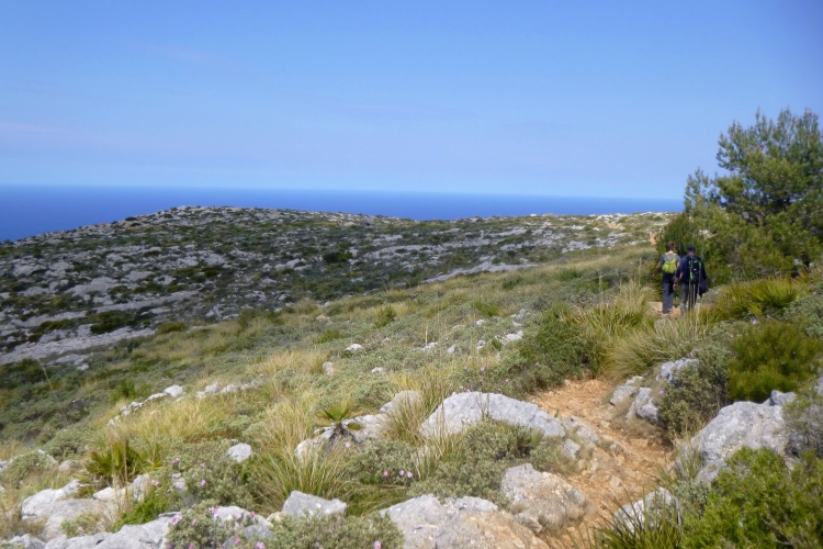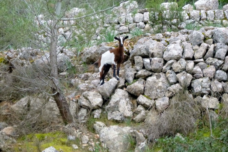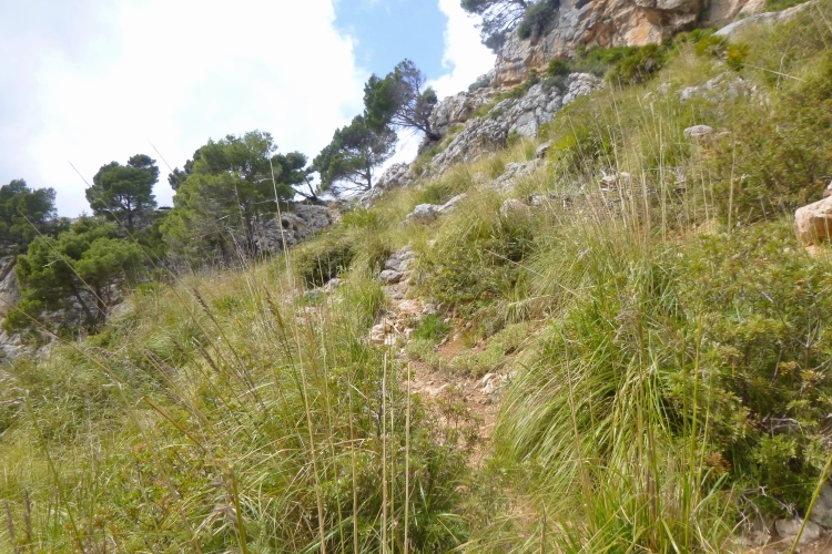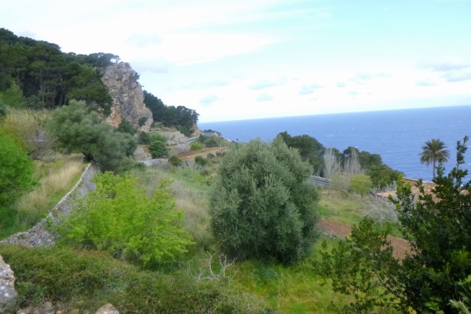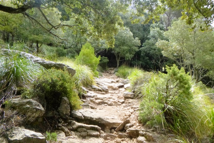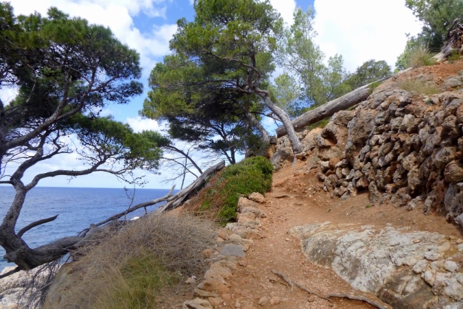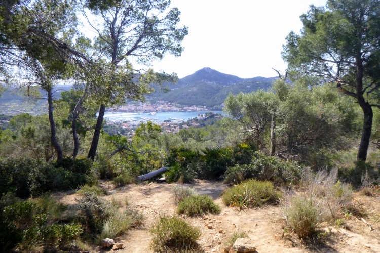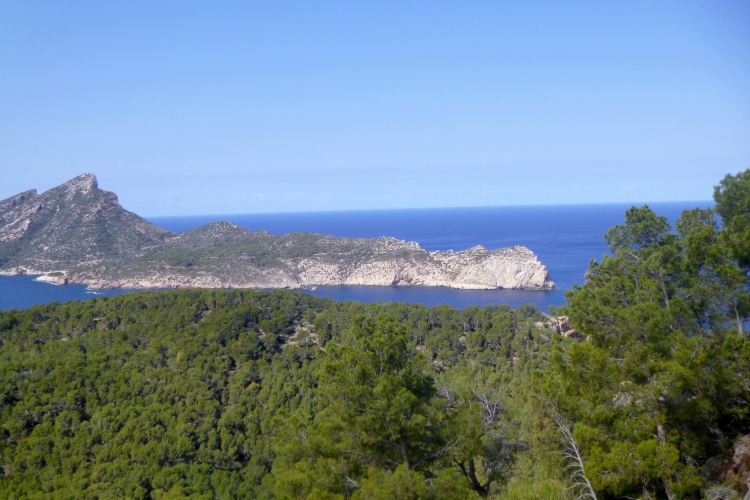 Der GR 221 beginnt hier nämlich nicht, sondern in Andratx. Es gibt also zunächst auch keine Schilder. Wir traben auf einer schönen Schmankerlstrecke in die Berge. Und es wird steil, von Anfang an. Gleich neben Hausnummer 8 ein wilder Trail. Warm und sonnig, es duftet nach Baumharz. Später folgen schöne Aussichtspunkte zurück oder zur Insel Dragonera. Das Böse unter der Sonne – dieser tolle Poirotfilm mit Peter Ustinov hat genau diesen Blick im Abspann.