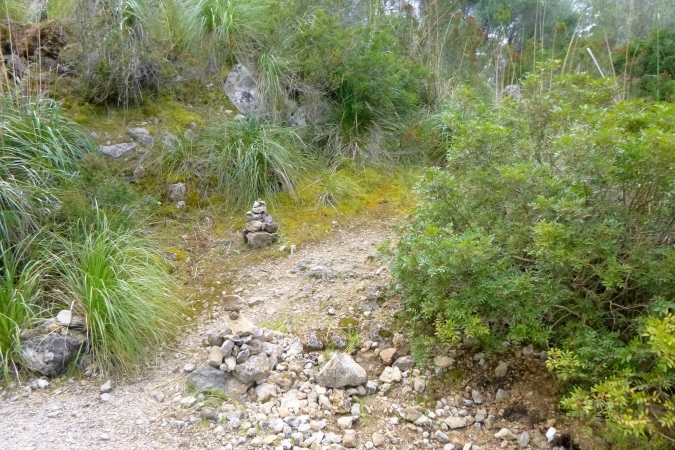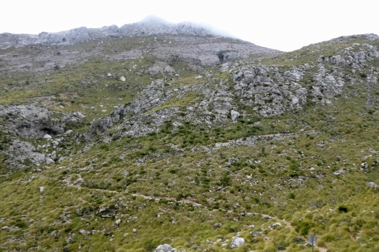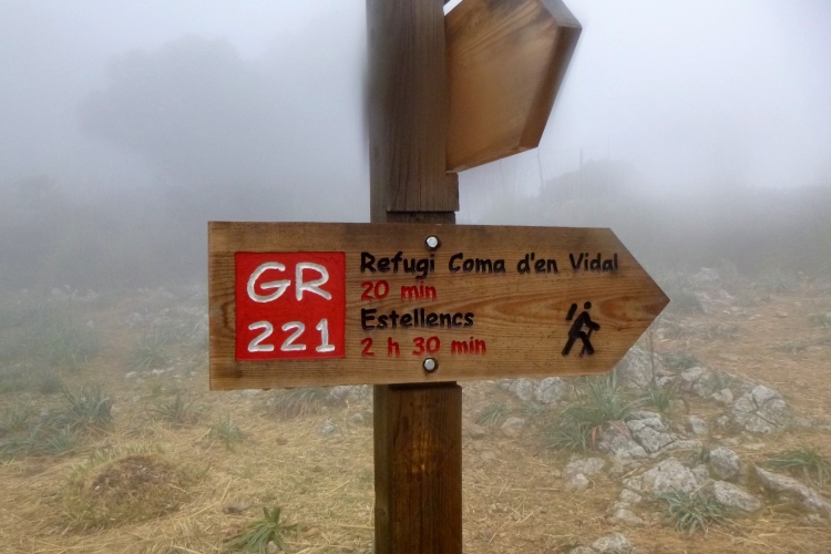 Ab hier kommt ein kniffliger Abschnitt: es führt nicht nur sausteil hoch, die Wegmarkierungen bestehen nur aus kleinen Steinmännchen, manchmal sind sie sogar sehr klein. Das können schon mal bloß 2-3 übereinanderliegende junge Felsen sein. Nebel kommt auch noch hinzu, starker Wind und später auch Regen. Der lockere Trail wird rasch zur Durchschlageübung. Keine Fernsicht und kalt wird es auch noch. Wehe, man hat an der Pflichtausrüstung gespart: kleine Sünden werden sofort bestraft! Falls es zu schlimm wird, kann man auf Alternativrouten ausweichen. Wenn man diese denn findet, denn markiert sind sie nicht. Ich finde sie nicht und muss über den Gipfel Mola de s Esclop. Auch die Wanderer, übrigens alle aus Deutschland, haben ihre Probleme. Gemeinsam finden wir da raus.
