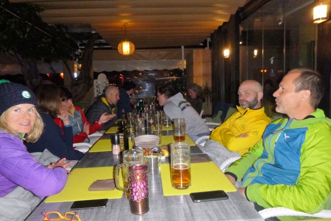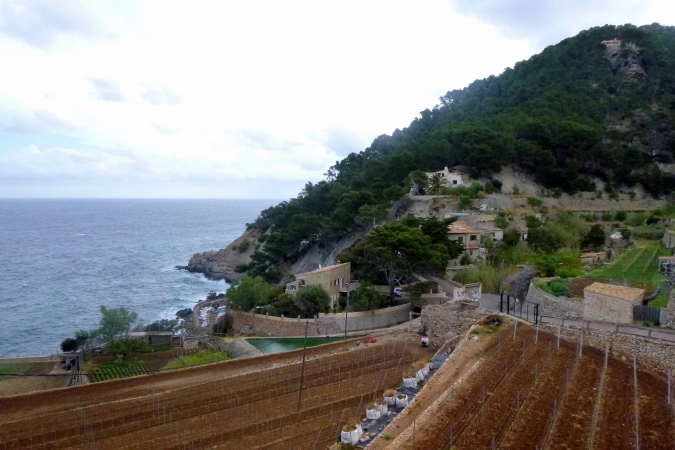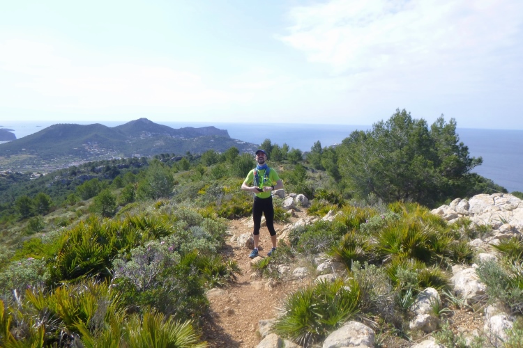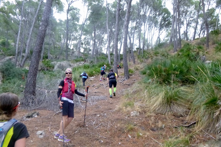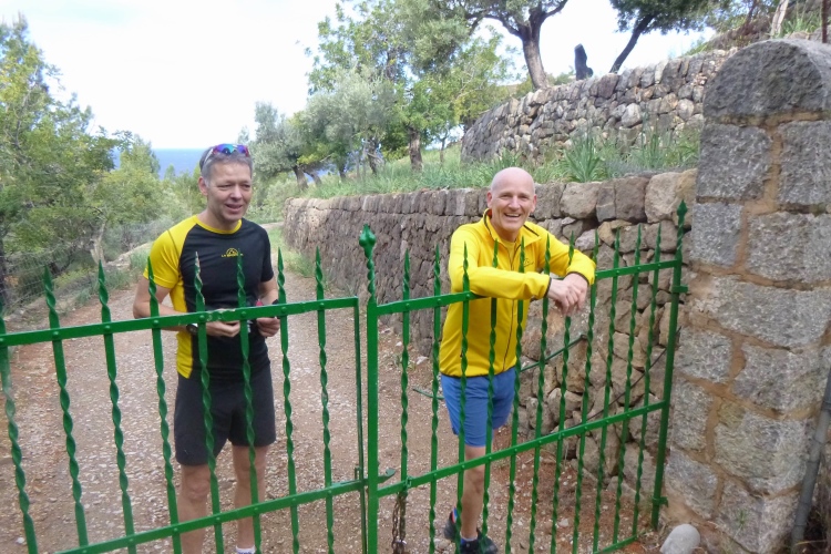 Frühstück, packen, Gepäck zum Shuttle tragen und so gegen 8 dann lostraben. Das lässt sich alles machen. Heute muss ich mich ranhalten, ohne GPS, nur mit dem Trailbook. Sicherer ist‘s mit den anderen, nur flitzen die enorm schnell dahin. Mal sehen, wie lange das gutgeht. Und flitzen macht ja soo einen Spaß, wenn der Weg stimmt. Einen besseren gibt es nicht: Weicher Waldboden, Singletrail, wellig, Ausguck aufs blaue Meer. Alle Malessen verwehen im Wind. Schilder gibt’s auch und Banyalbufar mit den berühmten Terrassen ist rasch erreicht. Nun flott runter, fast ans Meer, und wieder hoch: trotz GPS, trotz Ortskunde landen wir an einem überkrauteten Steilhang und oben ist auch noch ein Zaun. Aber wir sind wieder richtig und Michi bringt uns nun die Küste längs. Tolle Felswände, steinige Strände. In Port des Canonge steht unser Shuttle, Zeit für ein Bierchen!