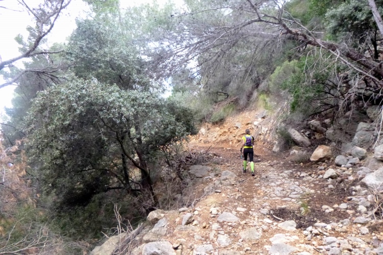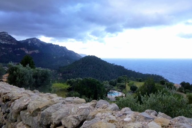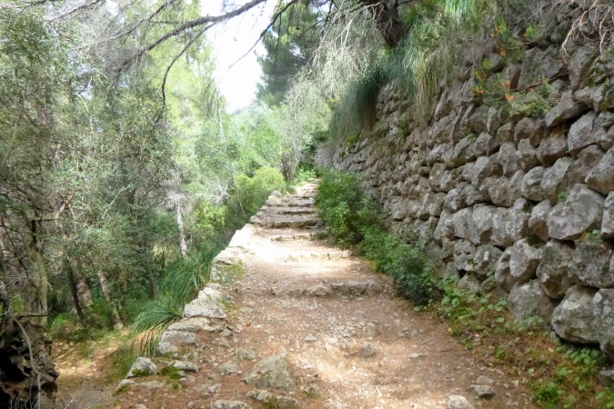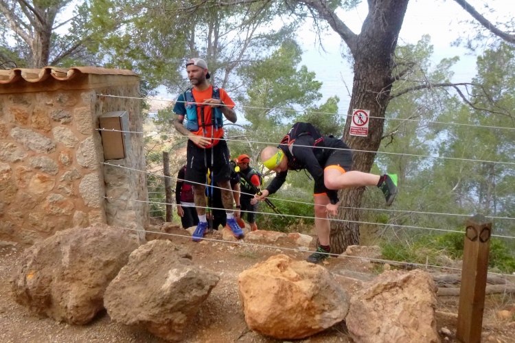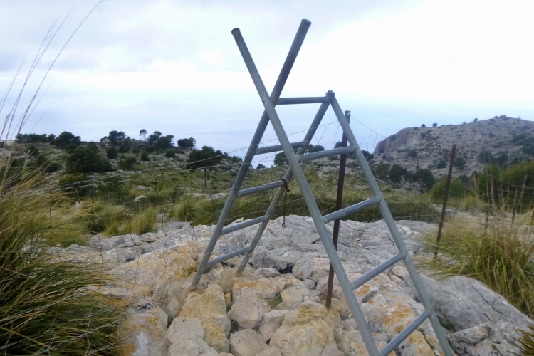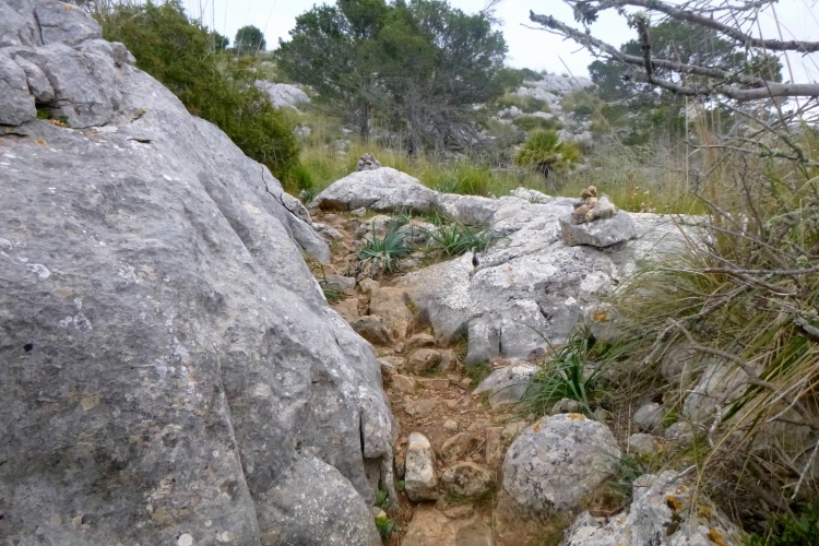 Langsam quälen wir uns hoch. Ein kleiner Bagger räumt für uns den Weg ab, schiebt Steine beiseite. Und plötzlich sind da viele Steinhaufen. Klar, wir traben erstmal vorbei. Die knapp streicholzschachtelgroße Pfeilmarkierung erkennt man noch nicht mal, wenn man direkt davor steht. Und der Steinhaufen ist eher eine Geröllwand. Egal, wir sind Trailer und arbeiten uns rüber. Tiefstes Gestrüpp erwartet uns, und ein paar Steinmännchen. Sieh an. Oben eine Leiter, ab über die Mauer und über die Straße. Auf der bleiben wir die nächsten 3 km. Zur Halbzeit sind wir in Valldemossa in der Pizzeria Vesubio.