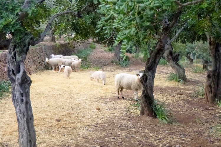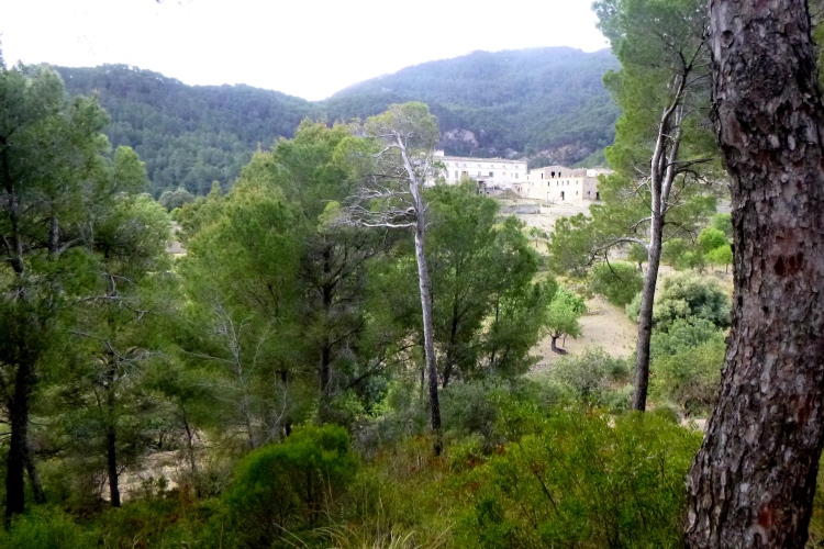 Nach dem zweiten Pass verlassen wir die Höhe, erst auf Trail, dann ein Stück Kopfstein, dann Schotterweg mit dem Ziel Kloster Lluc. Steil abwärts und unten in einen dichten Olivenwald, mittendrin ein merkwürdiger Bau: schön gemauert, wie ein tiefer Pool. Es ist ein Schneehaus aus der Vor-Kühlschrankzeit. Hier kam der Schnee rein, eine Plane drüber, und schon hatte man für den Sommer was Kaltes zur Hand. Öko pur und garantiert ohne CO2-Gedöns. Jetzt wieder den Schildern nach zum Kloster. Dort ist Fiesta, schöne Musik klingt bis hierher die Hänge hoch. Aber es nicht wegen uns, kein Zieleinlauf oder so, aber trotzdem schön.