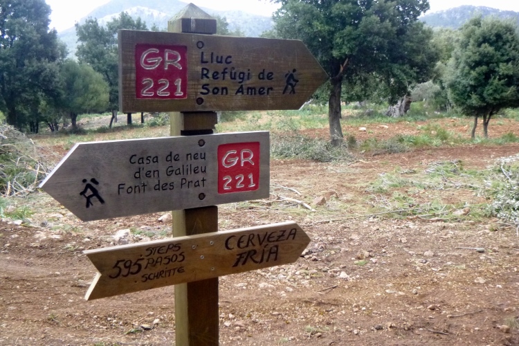 Ein paar Ziegen lenken mich ab, dann das Schild „595 Schritte bis zum Bier“. Die denken hier mit! Gleich danach ein große Parkplatz und überall Leute. Sie grillen oder strömen zur Fiesta. Etwas die Straße noch, dann weiter auf Schotter. Ein paar Serpentinen sind es zum Rifugi Son Amer, eigentlich der Endpunkt heute wegen dem angesagten Schietwetter. Aber das findet ja nicht statt und so laufen die meisten von über den Puig Tomir (1060 hm) nach Pollenca oder über die Talvariante des GR221. Für sowas reicht‘s bei mir nicht mehr. Ich bin überfressen, die Suppe mit Einlage, das Fleisch mit Kartoffeln und Pilzsoße, der Rotwein – ich bin einfach nur satt. Also: Ich muss unbedingt nochmal herkommen und die fehlenden Abschnitte nachholen. Wer also nächstes Jahr mitwill – bitte melden! Ich will wieder!