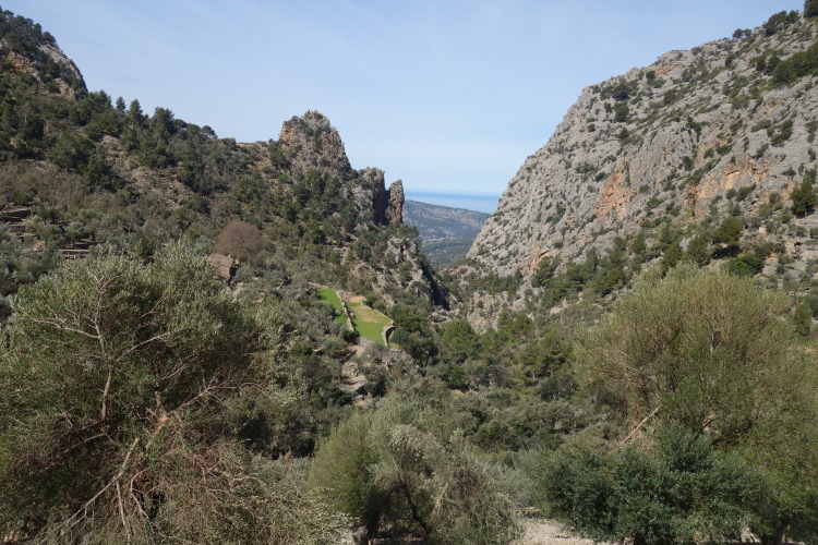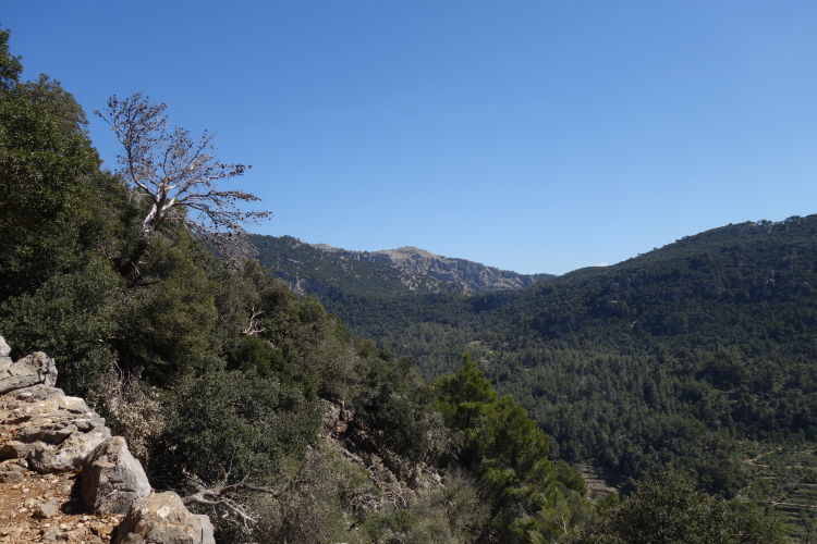 Ein Hochtal mit wenigen Bäumen wird durchlaufen. Die ersten wild lebenden Ziegen tauchen auf. Für Mallorca sind diese Ziegen ein echtes Problem. Durch ihren großen Appetit fressen sie nachwachsende Bäume weg und hindern die Wiederaufforstung.