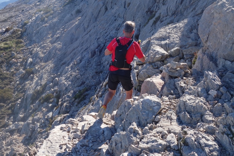 Michael kommt auf den Gipfel gestürmt. Wir geniessen zusammen das wirklich überwältigende Panorama, dann geht es an den Abstieg. Wir müssen uns etwas sputen. Über die löchrigen und vom Karst zerfressen Kalkfelsen geht es steil abwärts. An den Resten eines verfallenen Gemäuers vorbei, teilweise über kurze Stellen kletternd kommen wir an einen Sattel. Hier warten wieder die harten Gräser auf uns.