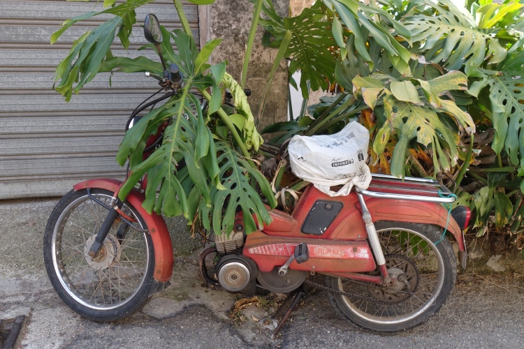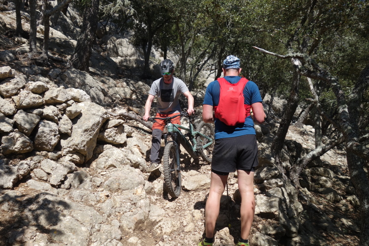 Der Weg ist durchaus urwüchsig zu nennen. Es wird steiler und wir müssen mächtig arbeiten. Das Gelände ist nicht für Fahrräder geeignet, dennoch begegnen uns zwei Radler – ihr Rad aber über die Steine tragend. Selber schuld. Raoul, Stefan, Andreas, Michael und Michael laufen auf uns auf.