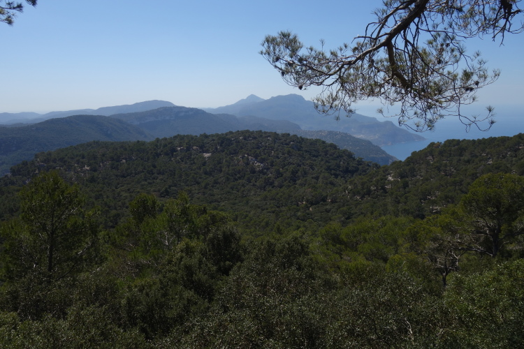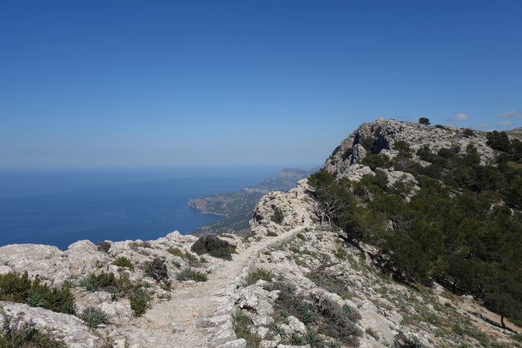 Immer wieder gibt es weite Fernblicke, mal die Küste zurück, mal voraus. Wir kommen an einen fantastisch schönen Gradweg. Es ist der “Reitweg des Erzherzogs” - Cami des Arxiduc, der wohl berühmteste Wanderweg der Insel. Den Auftrag zur Anlage des Weges kam vom österreichischen Erzherzog Ludwig Salvator. Auf seine früheren Besitzungen Miramar und Son Marroig können wir hinunter schauen. Der Weg erstreckt sich in 800m Höhe über einen Grad entlang einer gut 200m hohen Abbruchkante. Hier wird dem Auge so einiges geboten, auch die Halbinsel mit dem berühmten Felsloch an der Punta de Sa Foradada ist weit unter uns zu sehen. Einfach spektakulär, einer der Höhepunkte der Strecke.
