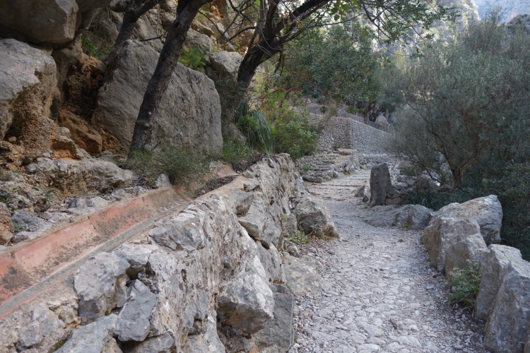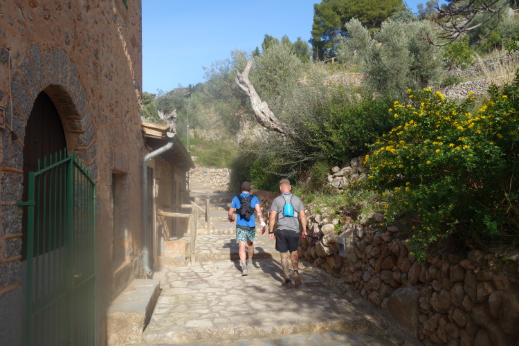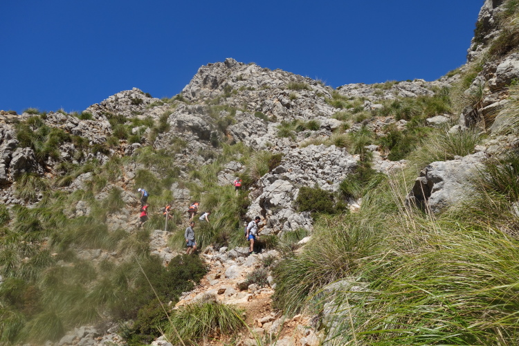 Durch die Schlucht des Barranc de Biniaraix führt ein historischer Pilgerweg in vielen steilen Serpentinen hinauf zur Finca l'Ofre. Die Serpentinen des Cami des Barranc sind ein echter Hammer, gilt es doch gut 700 hm zu bewältigen. Ein wahrhaft heftiger Einstieg in den Lauftag. Für mich zu hart. Ich lasse die Truppe alleine starten. Die Strecke über Biniaraix, die Schlucht des Barranc des Biniaraix bis zum Cúber Stausee ist mir auch vertraut. Und ich muss ja Körner sparen.