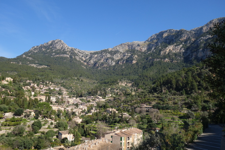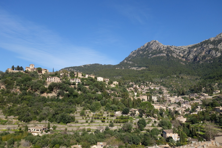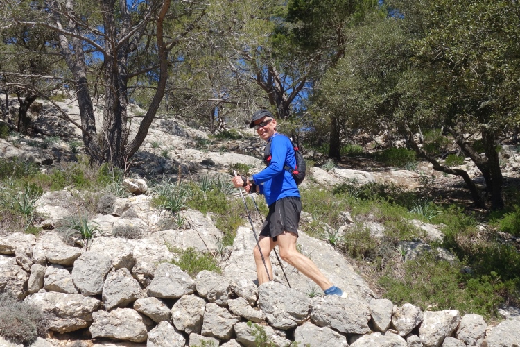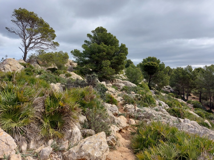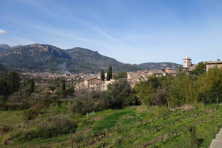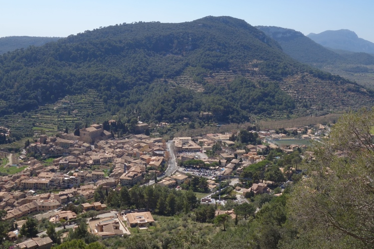 Ich habe Premiere heute. Erstmals laufe ich mit Stöcken. Durch Steineichenwald geht es hinauf. Es öffnen sich herrliche Blicke auf das unten im Tal liegende Valdemossa. Weiter oben schaut man sogar bis zur Bucht von Palma. Aber man sollte auch hier schon den steinigen Untergrund im Auge behalten.