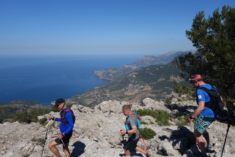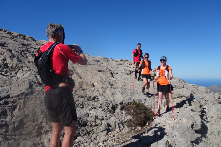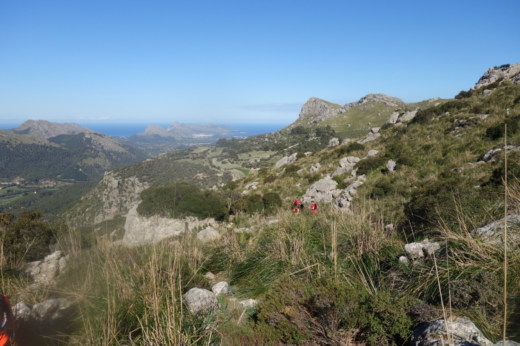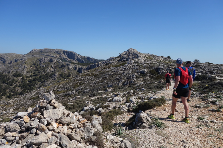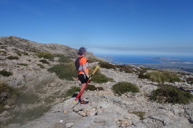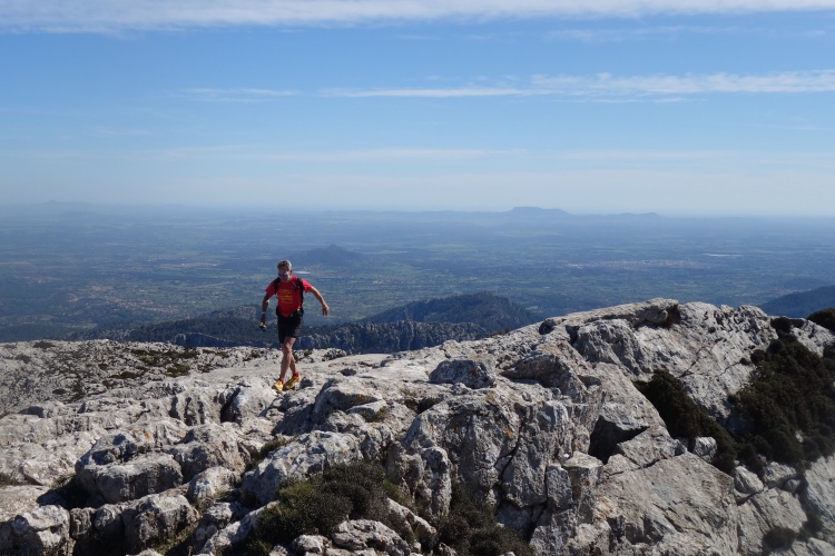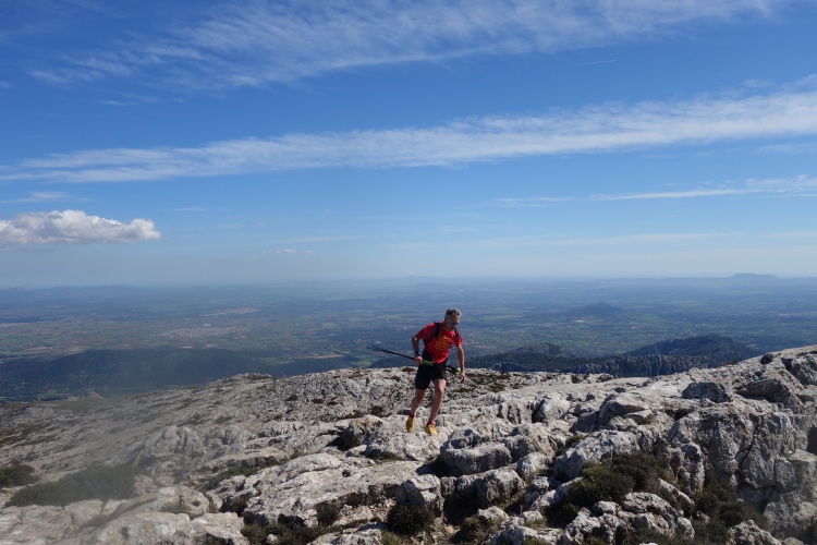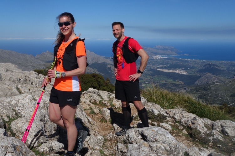 Plötzlich bietet sich uns ein grandioser Weitblick fast über die ganze Insel. Vor uns liegen die Buchten von Pollenca und Alcudia, das Cap Formentor, sogar Palma ist am Horizont zu sehen. Andrea und Kerstin treiben uns nach oben. Wir sind ja noch nicht am Gipfel. Ein wenig müssen wir linker Hand noch an Höhe gewinnen, dann ist es vollbracht. Wir stehen auf dem Gipfel des Puig Tomir, 1.103m. Ein wahrer Höhepunkt des Trails.