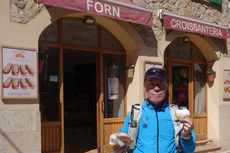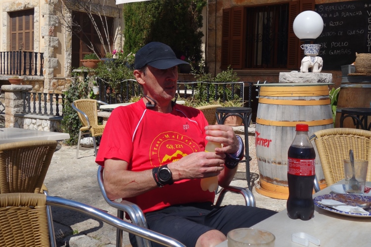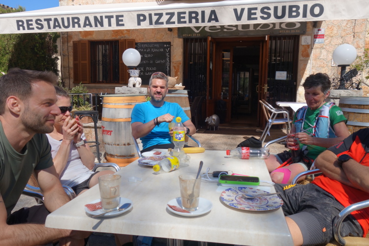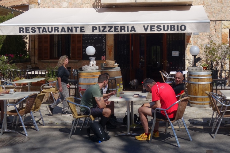 In Valdemossa ist etwa die halbe heutige Tagesetappe vollbracht. Hier warte ich auf meine zukünftigen Mitläufer. Die laufen von Estellencs über wunderschöne Wege, u. a. über Banyalbufar bis Valdemossa. Michael steht schon mit seinen Tourbus am Treffpunkt vor dem Restaurant Vesubio. Die ersten Läufer sind auch schon angekommen und machen Rast mit Getränkezufuhr.