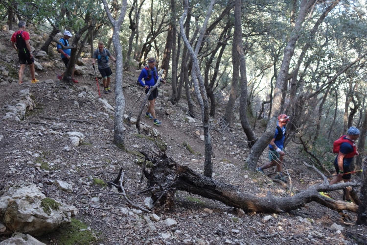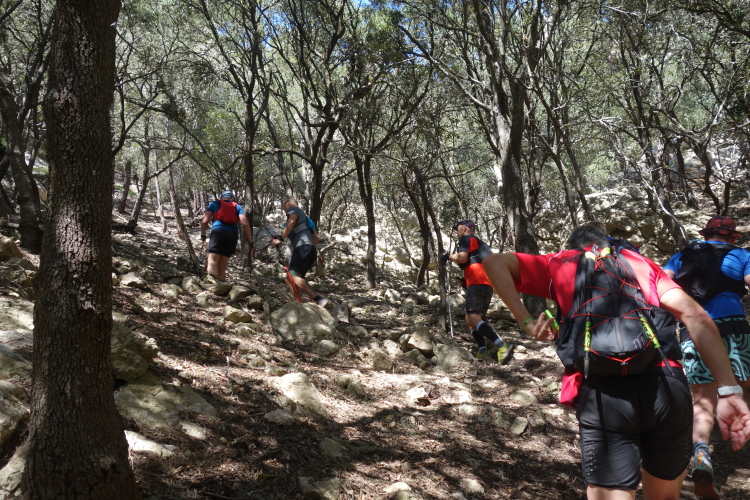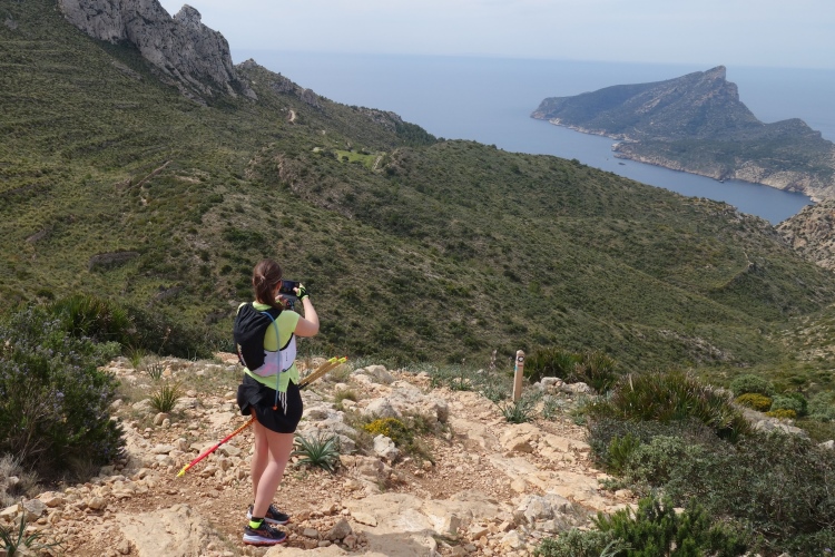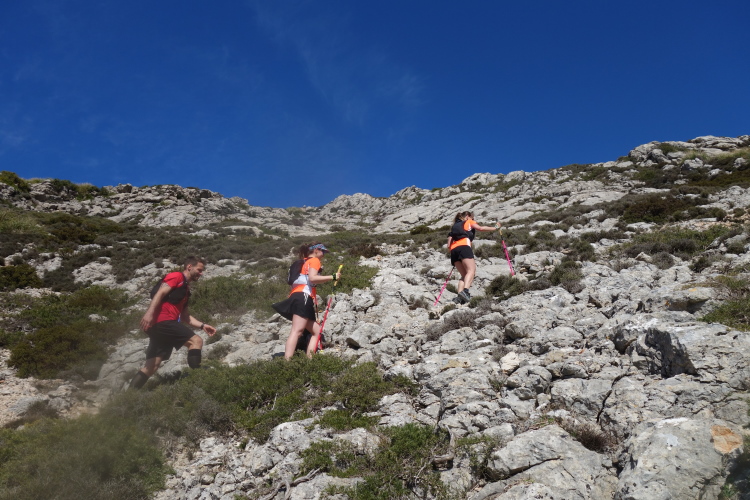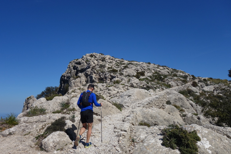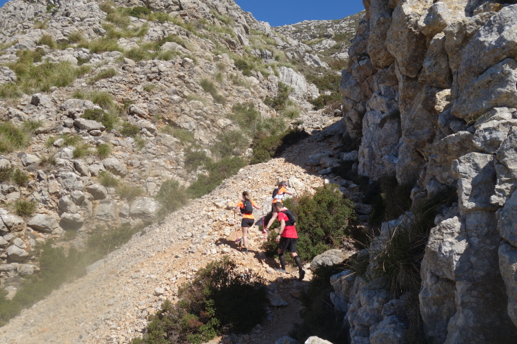 Andrea bricht als Erste auf. Ich folge ihr. Zusammen machen wir uns auf den Anstieg zum Puig Tomir. Bis zum Gipfel liegen zwar nur 5,6 km vor uns, aber fast 600 Hm. Zunächst geht es noch gemächlich bergan, aber das ändert sich rasch. Und bald schon ziehen die ersten zwei “Verfolger” an uns vorbei. Das ist das schöne an diesem Lauf: Jeder kann seinen eigenen Rythmus pflegen. Wir lassen uns nicht von unserem Tempo abbringen.