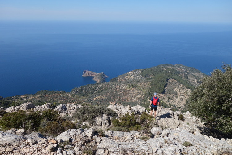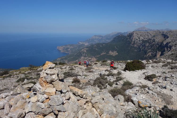 An einer großen Steinpyramide kann man zum Aussichtspunkt Mirador d'en Josep Sastre am Cap Fabioler laufen. Zusammen mit Andrea mache ich den kurzen Abstecher und geniesse den grandiosen Blick entlang der Nordküste. Zurück zur Steinpyramde und dann geht es abwärts. Vorbei an den Caseta de ses Basses kommen wir an eine Weggabelung. Von S'Arraco stößt hier eine Zugangsvariante auf den Fernwanderweg GR-221.