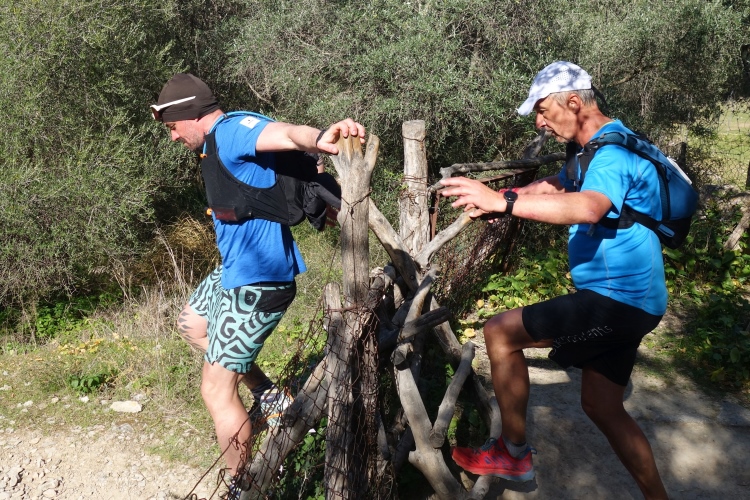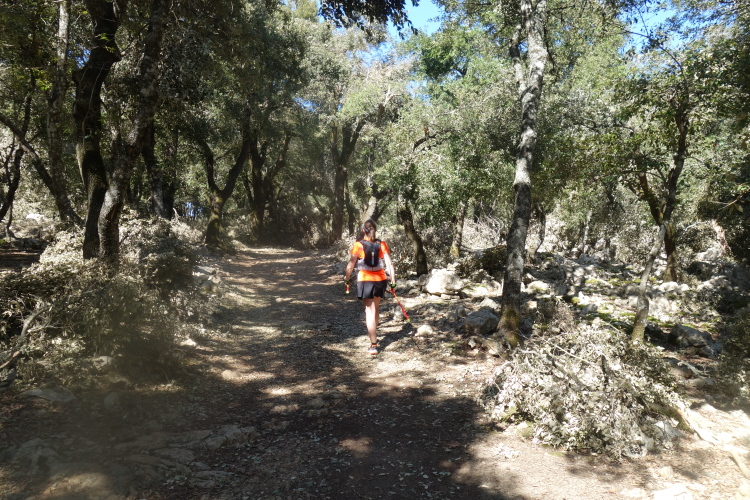 Die Strecke bietet wieder alles. Steineichen, Kiefern, Olivenbäume, breite Schotterwege, schmale Pfade, weichen Walduntergrund, Viehgatter, Sonne, Schatten … Es wird uns nicht langweilig. Und wir kommen voran.