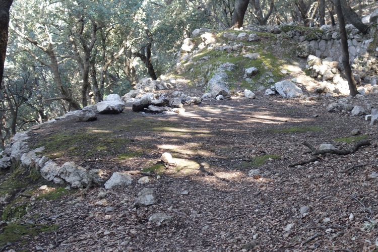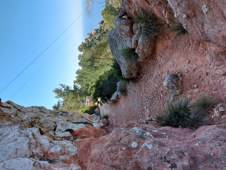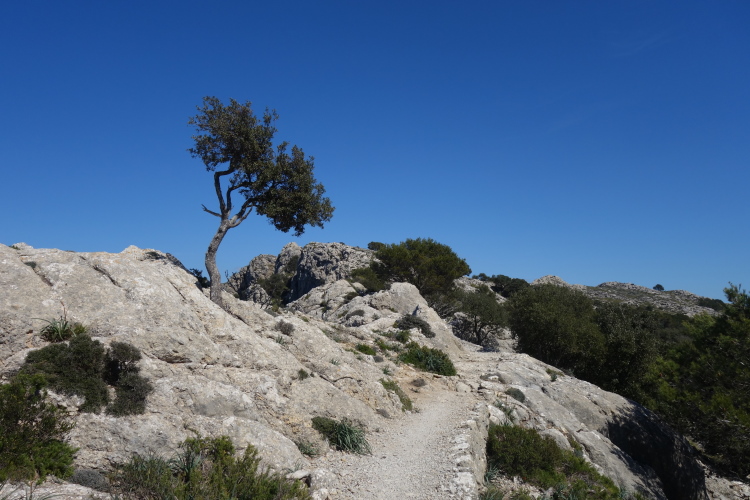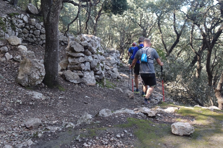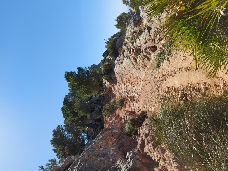 Nach gefühlten einigen hundert Fotos nehmen wir den steilen Abstieg hinunter nach Deià in Angriff. Und der hat es in sich. Zuerst noch in der Sonne, dann im Schatten. Rechts Felswände, links Steineichen. Der Trail ist einfach nur schön, erfordert aber unverändert hohe Aufmerksamkeit. Immer wieder tauchen kleine Köhlerplätze auf, wo früher Holzkohle produziert wurde.