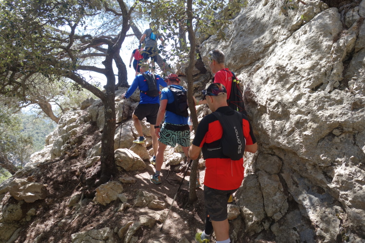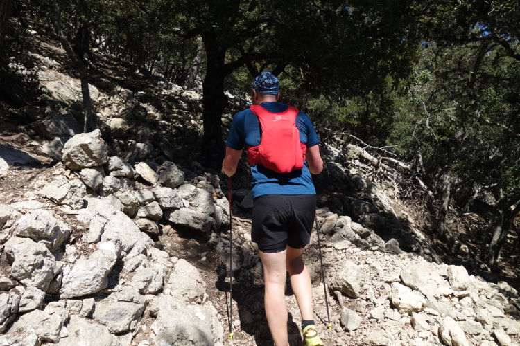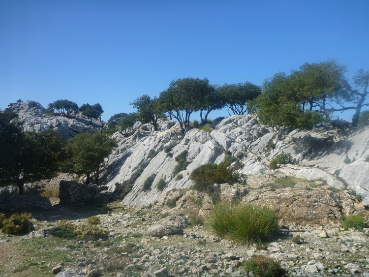 Endlich wird es weniger steil. Die Vegetation verändert sich. Wir sind raus der Steineichenzone. Es gibt nun Kiefern und das in dichten Büscheln wachsende Gras, an dem man sich gut die Hände aufschneiden kann. Obacht! Das gilt auch für die Beine, am Gras kann man gut hängen bleiben.