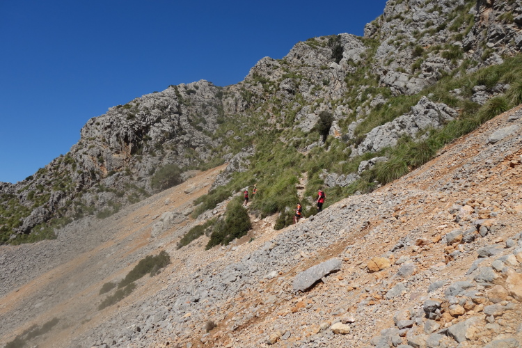 Wir kommen aus dem Wald heraus an den Bergfuss. Der “Sturm”auf den Puig Tomir beginnt. Bei dem mühevollen Aufstieg durch eine Schutthalde mit unangenehmen Schotter stoßen Christian, Kerstin und Markus zu uns. Christian ist nicht zu halten und stürmt voran. Bald ist er nicht mehr zu sehen.