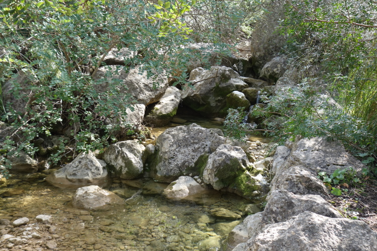 Vor uns liegt der Abstieg hinunter zur Cala Deià. Zuerst auf einem Pfad, über eine Brücke queren wir den Bach und auf Straße legen wir die letzten Meter zur Bucht zurück. Wir gehen nicht zum Strand. Unmittelbar vorher wenden wir uns nach rechts auf den Trail und steigen aufwärts. Unter uns tummeln sich die Badelustigen.