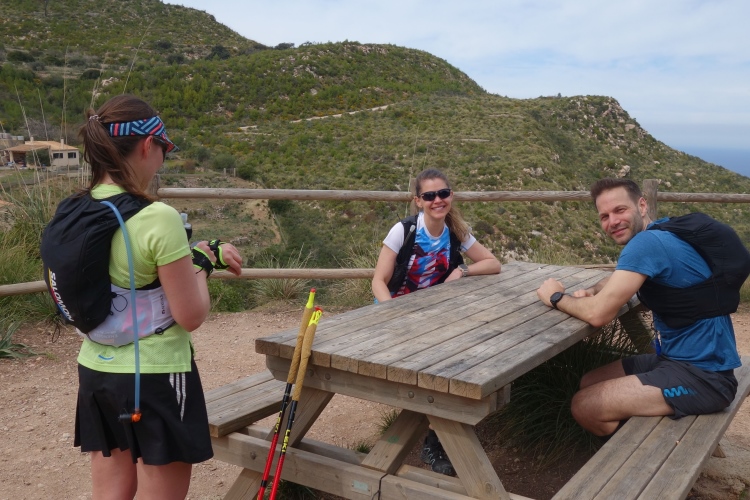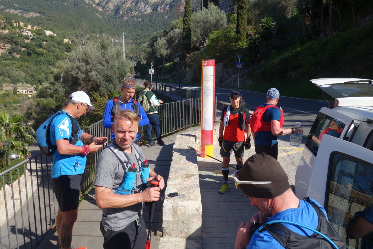 Am Col de Sa Gramola wartet Michael mit dem Tourbus. Die Läufer kommen nach und nach am Rastplatz an, fassen Wasser und stärken sich. Dann geht es weiter. Ich nutze die Gelegenheit und steige in den Tourbus um mit Michael zum heutigen Etappenziel nach Estellencs zu fahren. Gut 10 Km mit 529 bzw. 257 Hm Rauf bzw. Runter reichen mir. Morgen will auch ja auch noch laufen. Schade, so entgeht mir ein interessantes Teilstück um die Berge Galatzó und Esclop.