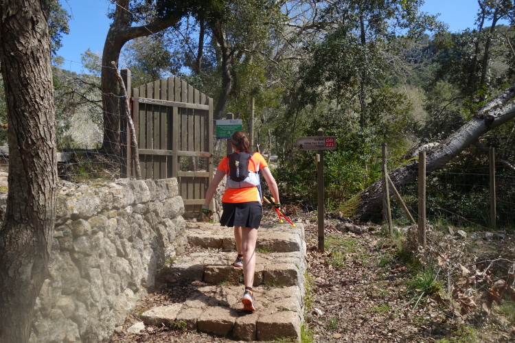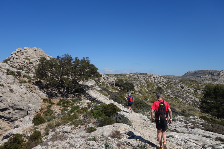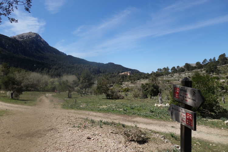 Nach einigen Felsen wird es einfacher zu laufen. Leicht wellig geht es vorwärts. Wunderschön. Die Klosterruine von La Trapa taucht unter uns auf. Hier gründeten 1810 Trappistenmönche im Hochtal von Sant Josep ein Kloster. Dieses wurde aber schon zehn Jahre später vom Staat aufgelöst. Heute kümmert sich eine balearische Naturschutzorganisation um das Gelände.