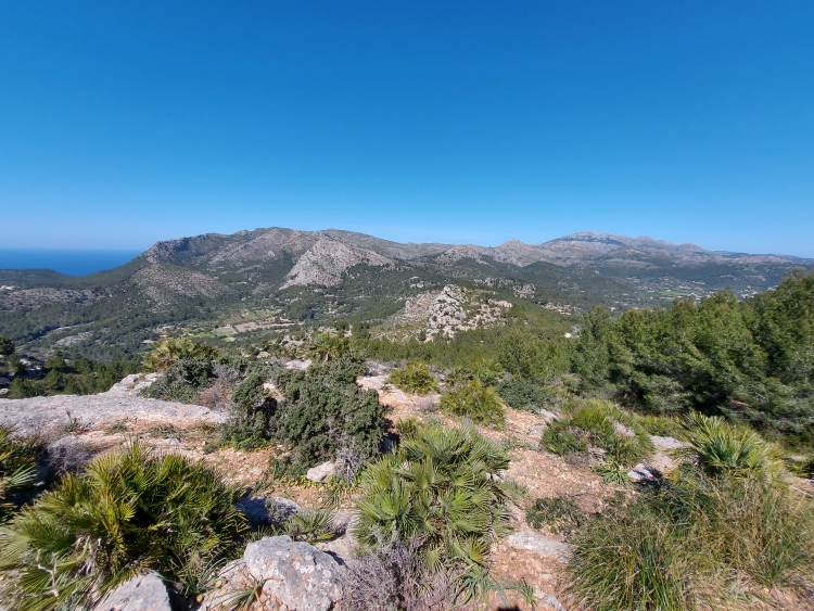 Es geht weiter Richtung Col de Sa Gramola. Das Wetter ist unverändert bestens. Die Sonne scheint und es ist warm. Der Weg ist wieder ein breiter Schotterweg und hat nur wenig Steigung. Die Blicke in die umliegende Landschaft sind beeindruckend und abwechslungsreich. Mallorca hat halt viel, viel mehr zu bieten als Ballermann.