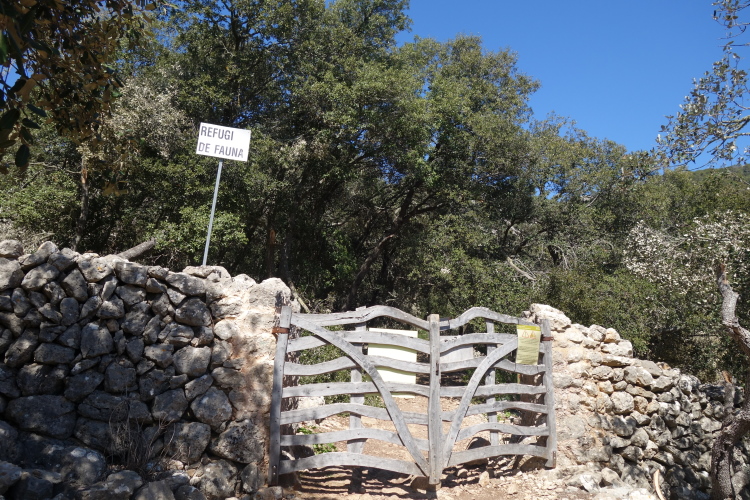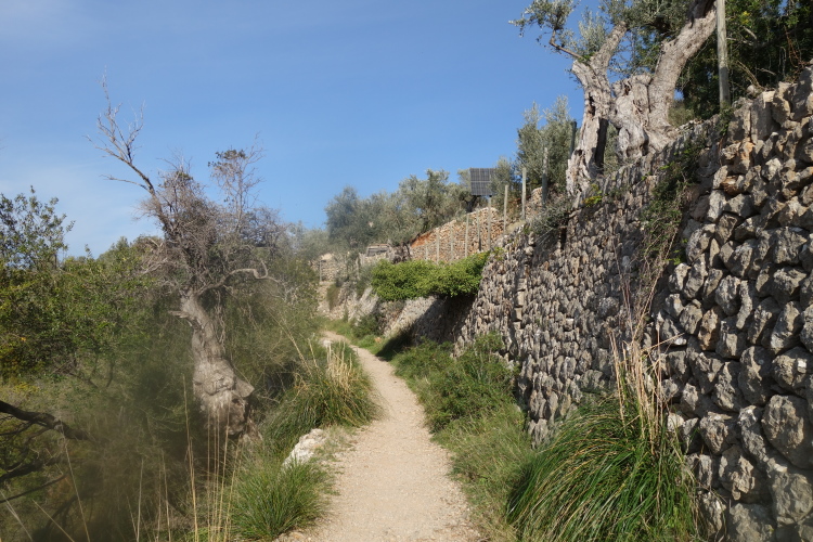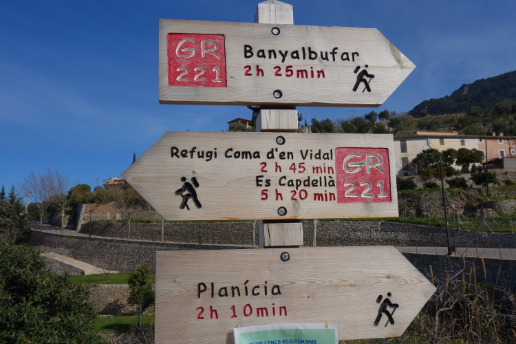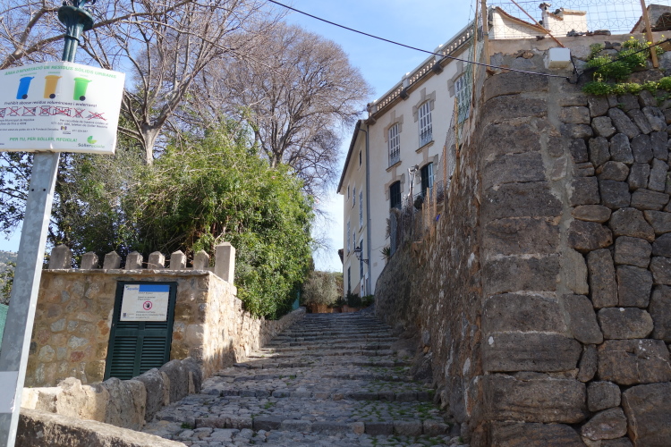 Vor einem Haus geht es hinauf, zuerst auf Treppen, dann rechts haltend nach Llucalcari. Hier überqueren wir die MA 10, durch zwei Steintore geht es hindurch und auf Straße aufwärts. Die Straße geht in einen breiten Schottenweg über. Obacht! An einer Kehre heißt es den Schotterweg zu verlassen und auf einen kleinen Pfad einzubiegen. Den gehen wir ein Stückchen hinauf und stoßen auf den GR 221 von Deià kommend.