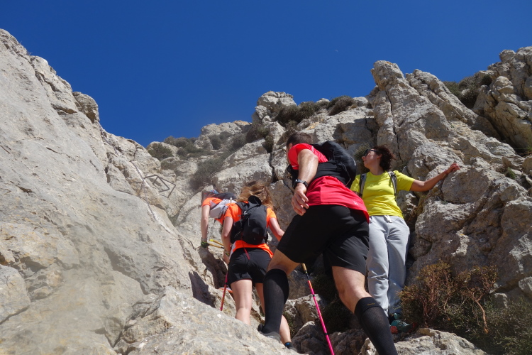 Zu viert kämpfen wir uns höher und höher. Obacht ist angesagt. Es geht die Schutthalde weit hinunter – sollte man ausrutschen. An den Felsen angelangt kommen uns Wanderer entgegen. Wenige Meter gibt es sogar Drahtsicherungen. Nicht unbedingt notwendig, aber ein sicheres Gefühl bietend. Wilde Bergziegen und ein Geier in großer Höhe beobachten neugierig was wir so machen. Für den Geier werden wir aber heute kein Futter abgeben.