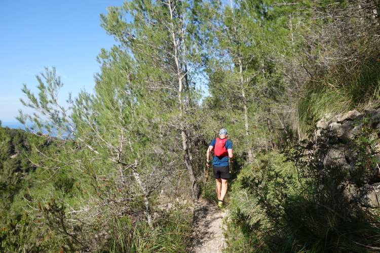 Mit mir fahren drei weitere Läufer im Auto mit Michael nach Sant Elm. Da die Bar Stefano am Strand noch geschlosen ist gehen wir durch die kleine Fußgängerzone. Nach dem Hafen beginnen wir zu laufen. Über die Avinguda de La Trapa geht es in den Wald. Eine breite Schotterstraße führt uns nach wenigen Minuten zum verfallenen Gemäuer des Can Tomevi. Direkt vor dem Haus laufen wir geradeaus in den Wald hinein. Es geht aufwärts. Und das ordentlich.