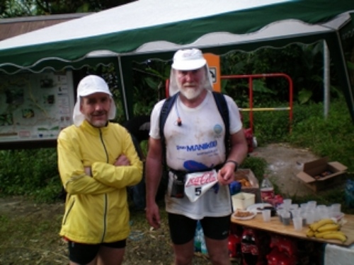 Mittlerweile bin ich wieder an einer Großverpflegungsstelle angekommen, und zwar an der, die unmittelbar vor einem dieser besagten mit Urwald bewachsenen Bergkegel liegt. Ich lasse mich auf einem Stuhl nieder, verspeise Salamistücke mit Rosinen, trinke wieder viel Cola und lege die Beine hoch. Ach, ich habe ja so viel Zeit… und lasse es mir gut gehen. Gert Schilling mit seiner Freundin trifft ein, ich wollte gerade ein Gespräch mit ihnen beginnen, aber nach Wasseraufnahme und Einnahme eines kleinen Snacks enteilen sie sofort wieder.