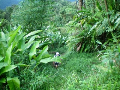 Sehr schnell begreife ich, dass diese humoristisch anmutende Zeichnung gar nicht so lustig ist, sondern die harte Realität widerspiegelt. Ich befinde mich auf einem Pfad in einem tropischen Bilderbuchurwald, der genau so gut im Amazonasgebiet wie auch am Kongo sein könnte. Zurzeit geht es immer wieder steilst nach oben… die Beschaffenheit des Pfades ist schmierseifenhaft glatt… mittlerweile sind die Wolken über uns verschwunden, die Sonne sonnt und brennt an wenigen Plätzen, an denen Urwaldriesen den Gewalten von Zyklonen zum Opfer gefallen waren.