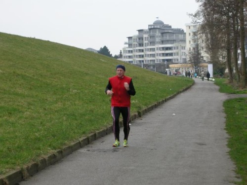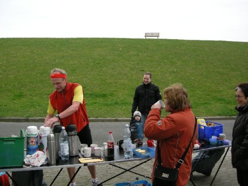Offensichtlich ließ mich diese "wohlige Kuschelatmosphäre" etwas zu sorglos agieren. Bereits bei meinem ersten Verpflegungsstelleerreichen drückte ich beim Versuch der Zwischenzeitnahme eine falsche Taste auf meiner Stoppuhr, und als ich dieses Missgeschick erkannt hatte, war ein solch großer Zeitraum vergangen, dass ich nach der Wiederingangsetzung der Zeitmessung nur noch "Hochrechnungen" vornehmen konnte. Außerdem vereinnahmte mich das herrliche Küstenpanorama mit den vorbeiziehenden teils riesigen Frachtschiffen über Gebühr, woraufhin ich frühzeitig entschied, das Genießen dieses Laufes in den Vordergrund zu stellen und mich nicht als "verbissen hechelnder Laufopa" zum Gespött der auf der Uferpromenade flanierenden Kurgäste zu machen.