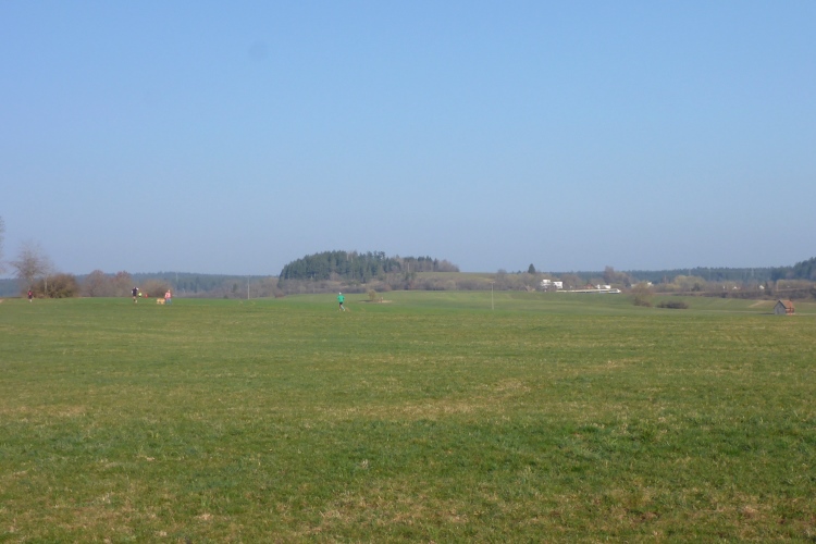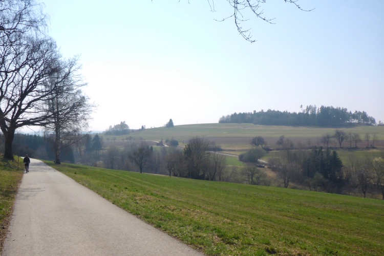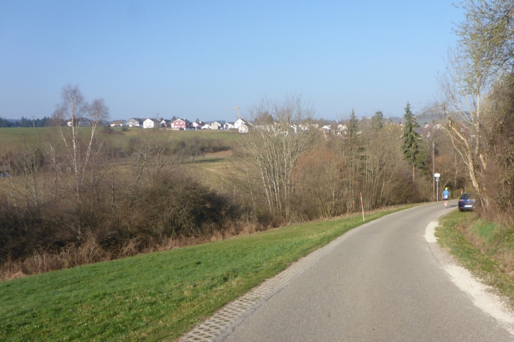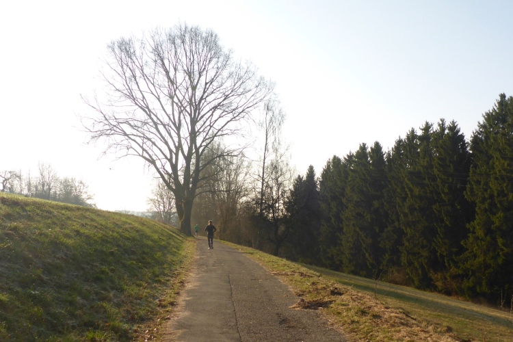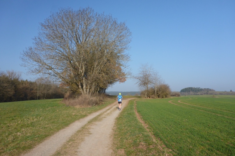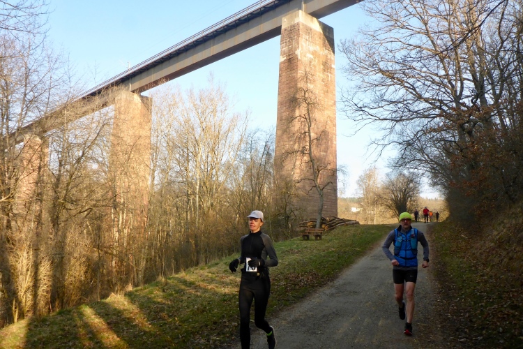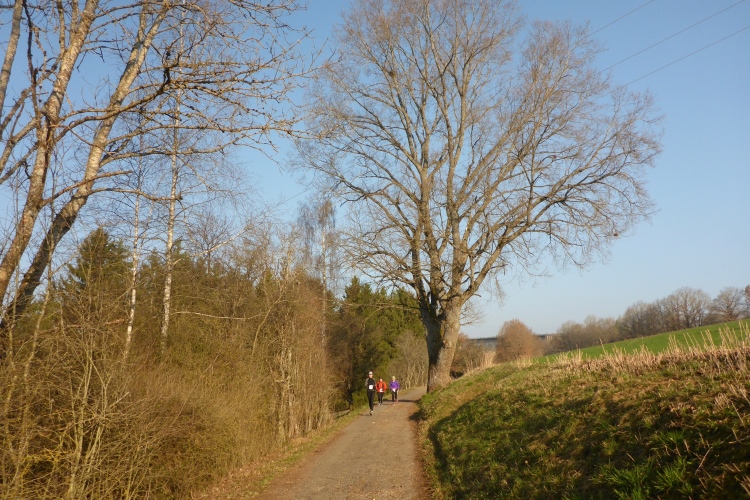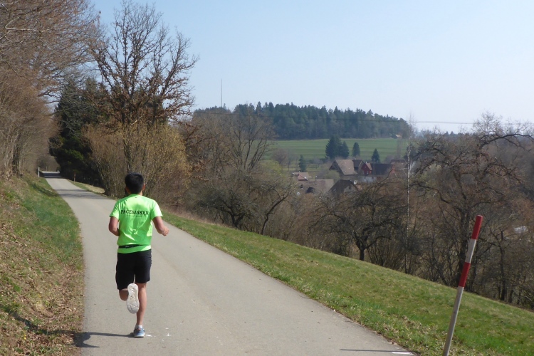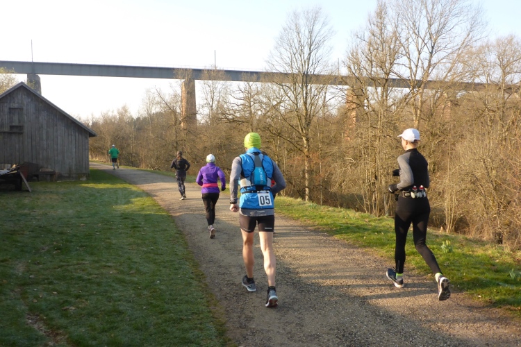 Nur kurz laufen wir durch den Ort, dann in einem Landschaftsschutzgebiet mit wenig Steigung zuerst bergauf, dann wieder bergab, unter dem Stockerbachviadukt hindurch. Das kleine Teilnehmerfeld zieht sich sehr schnell auseinander. Den Ort Aach passieren wir nur kurz am Rande. Dann folgt der erste Anstieg, bei dem ich den Fortbewegungsmodus auf schnelles Marschieren ändern. Schon nach 600 Metern kann ich aber wieder bequem über sonnige Wiesenflächen laufen.