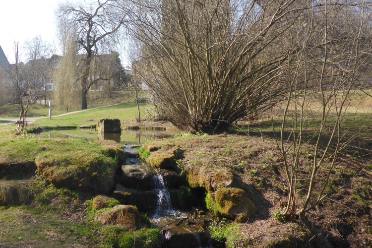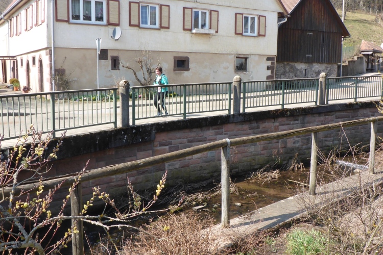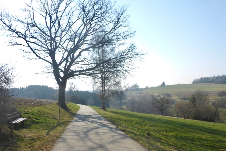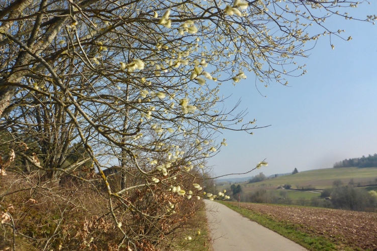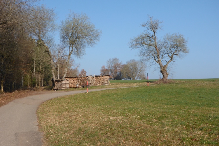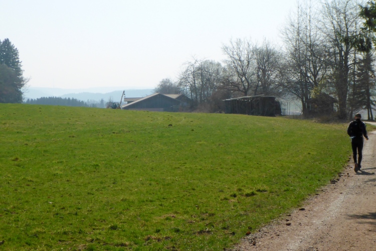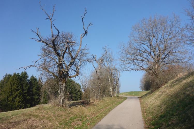 Dann erreiche ich wieder Wittlensweiler, marschiere die anstrengende Straße hinauf und wieder durch den Wald. Die extreme Trockenheit in diesem März führt leider unter anderem auch dazu, dass viele Frösche ihren gesamten Nachwuchs verlieren. Wo normalerweise in tiefen Rinnen neben dem Weg Kaulquappen schwimmen, vertrocknet der Froschlaich nun auf dem Sandboden.