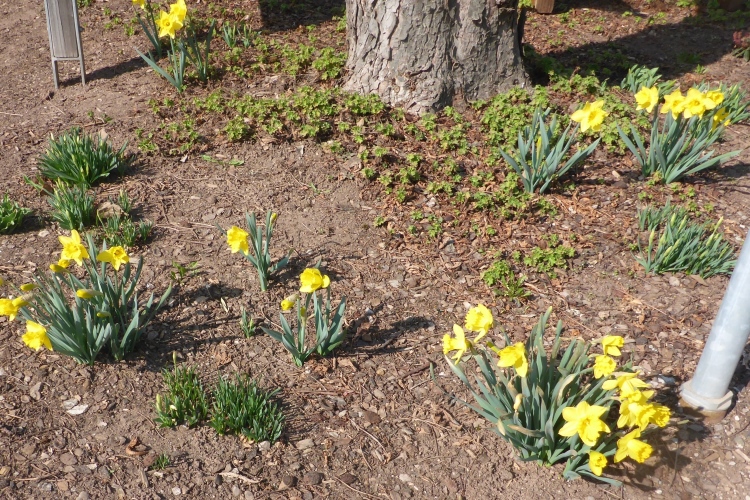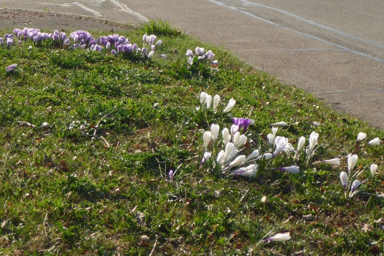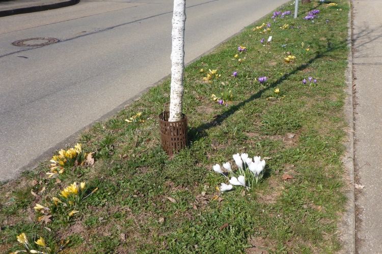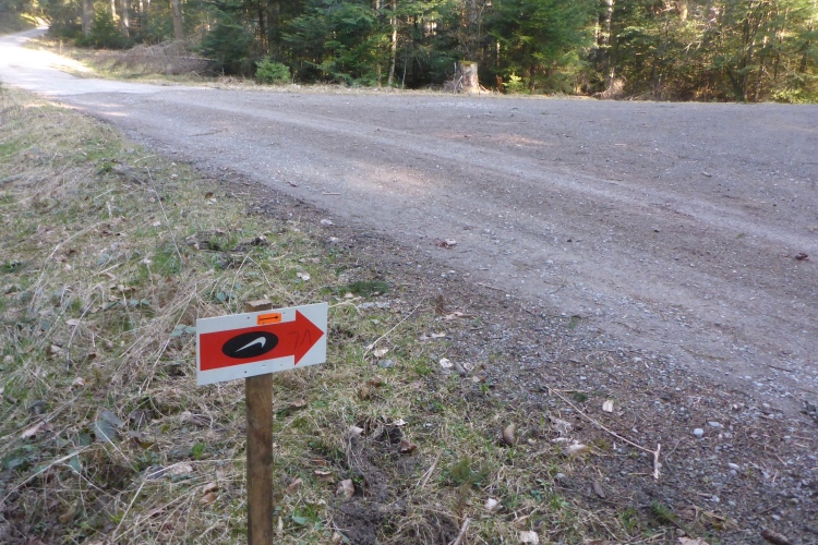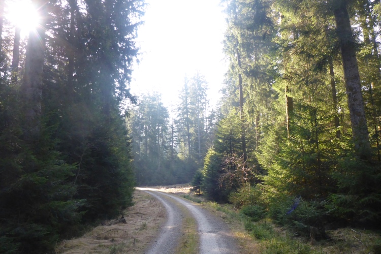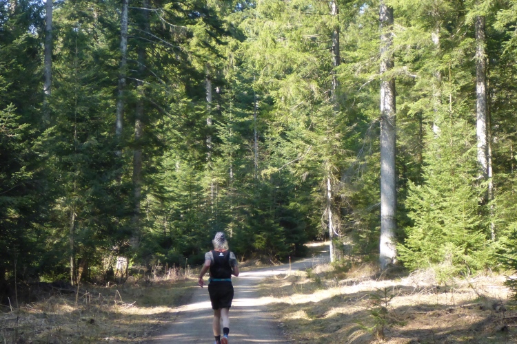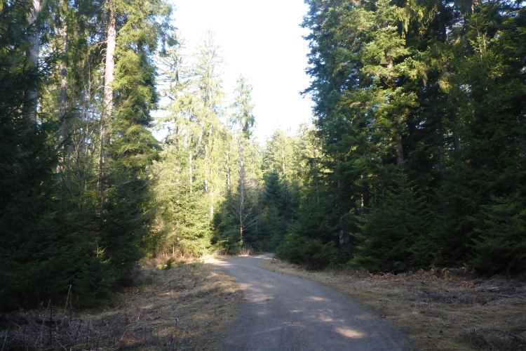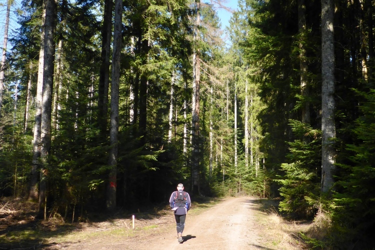 Nun muss der mühsamste Teil der Strecke bewältigt werden. Die Haldenbergstraße ist zwar nur 600 m lang, kommt mir aber länger vor, da sie mit bis zu 15 % Steigung bergauf führt. Viele Krokusblüten neben dem Fußgängerweg lenken mich von der Anstrengung ab. Ab dem Waldrand folgen dann recht entspannende sechs Kilometer auf bequemen Forstwirtschaftswegen durch dichten Nadelwald. Zuerst führt die hervorragend markierte Strecke lange Zeit mit nur wenig Steigung bergauf. Bei meinen ersten beiden Runden kann ich hier noch gut laufen. Ab dem mit etwa 770 m höchsten Punkt der Strecke geht es dann fast nur noch bergab, auch hier schnell und gut laufbar. Nur in der Senke des Gammertsbach laufe ich kurz etwas steil bergab und wieder hinauf.