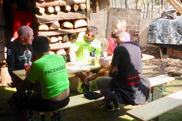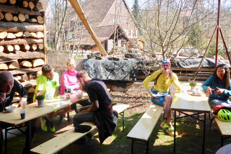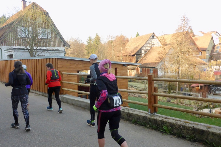 Als ich zum dritten Mal Grüntal erreiche, sitzen viele Teilnehmer bereits als Finisher gemütlich im Garten und essen Maultaschen, wahlweise mit Fleisch oder vegetarisch. Obwohl noch eine Runde vor mir liegt, esse ich ebenfalls davon. Dann rufe ich den anderen zu: „Ihr müsst jetzt hierbleiben, aber ich darf den warmen, sonnigen Nachmittag noch eine Weile genießen“ und laufe weiter.