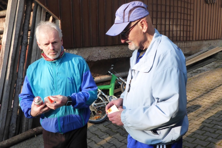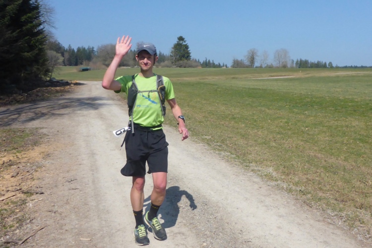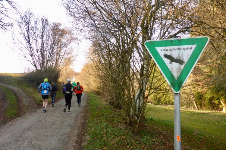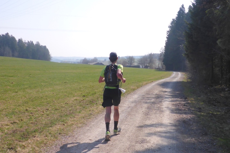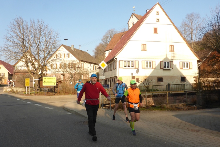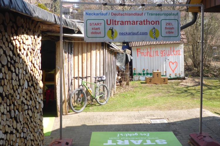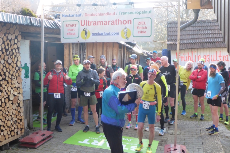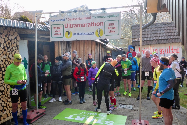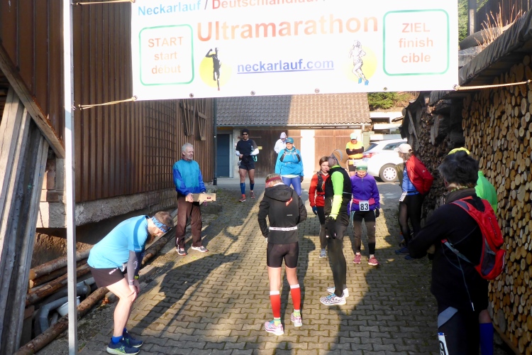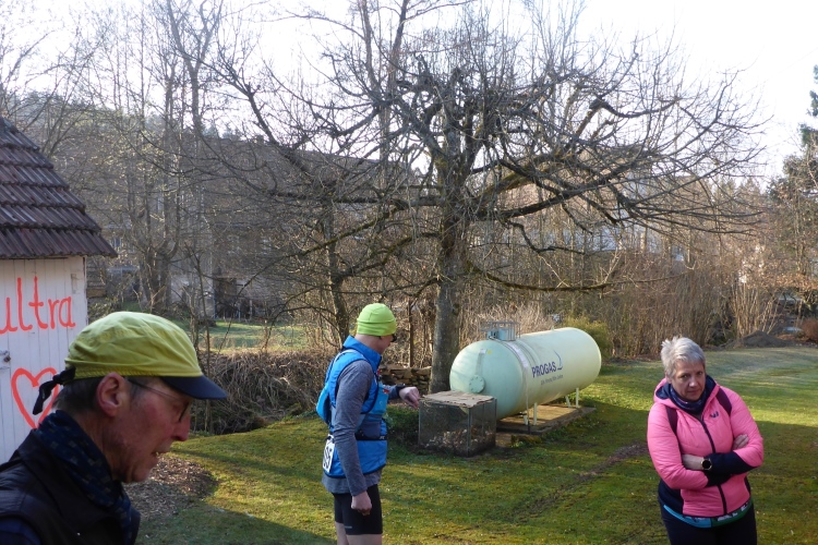 Beim Grüntal Frühlingsultra läuft man vier mal dieselbe Runde mit je 12,9 km und 293 Höhenmetern. Die leicht laufbare Strecke am nordöstlichen Rand des Schwarzwalds führt über bequeme Feld- und Waldwege, manchmal auch über Asphalt. Start, Verpflegung, Ziel und auf Wunsch auch kostenlose Übernachtung ist direkt im Haus des Veranstalters Thomas Dornburg in Grüntal, einem Vorort von Freudenstadt. Da es draußen am frühen Morgen mit 5 Grad recht kalt ist, frühstücken wir im Keller. Erst kurz vor dem Start gehen wir ins Freie. Thomas Dornburg, der unter anderem auch Veranstalter eines neuen Deutschlandlaufs und Transeuropalaufs ist, sowie Ingo Schulze, der legendäre Veranstalter der klassischen Vorgänger, erzählen uns etwas über die Streckenmarkierung. Pünktlich um 8 Uhr gibt Ingo den Startschuss, dann laufen wir los.