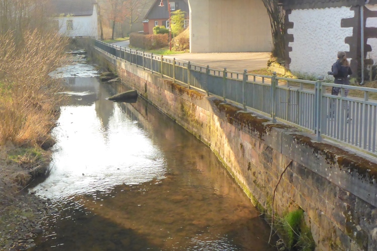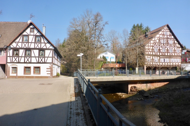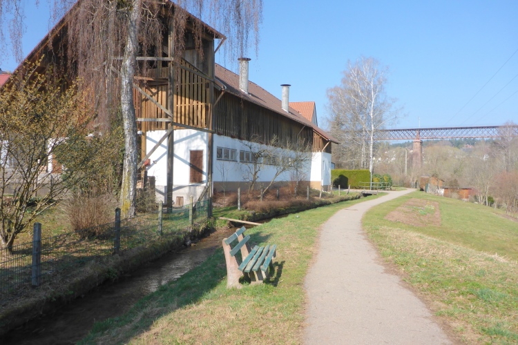 Bald führt uns ein Asphaltweg hinab in den Ortsteil Wittlensweiler. Dort folgen wir unter anderem einem schönen Spazierweg am Ufer des Mühlenbach. Dann laufen wir unter dem Ettenbachviadukt hindurch.