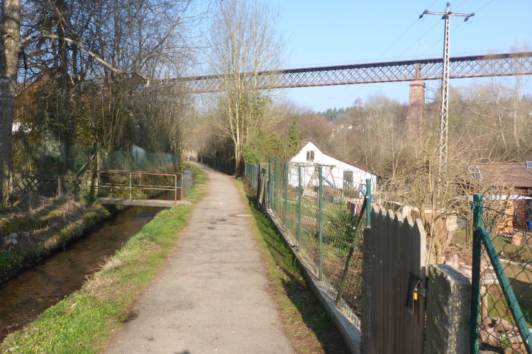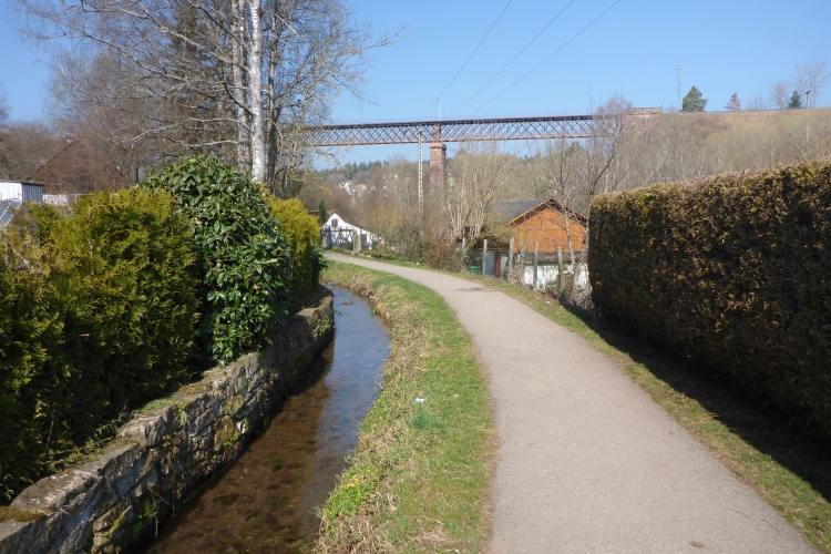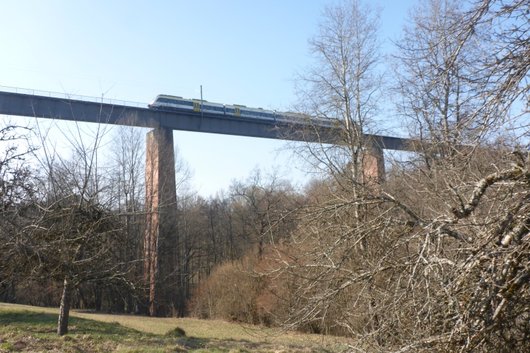 Als ich wieder das 1879 errichtete Stockerbachviadukt erreiche, fährt gerade eine Bahn über die 296 m lange und 42 m hohe Brücke. 1945 wurden Viadukt kurz vor dem Einmarsch der Franzosen von der Deutschen Wehrmacht zerstört. Bereits 1949 wurde es wieder aufgebaut.