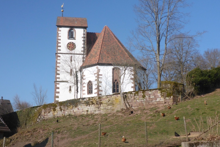 Am Ortsrand von Grüntal führt mich eine Straße kurz recht steil bergab. Dann laufe ich unter der 1592 erbauten Johanneskirche vorbei. Schon habe ich die erste Runde geschafft. 90 Minuten – deutlich schneller als geplant! In der Hofeinfahrt wird unsere Zwischenzeit notiert. Zwei Tische sind gut mit Verpflegung und Getränken bestückt. Wer will, kann hier eine kurze Pause einlegen und seine am kühlen Morgen notwendige warme Kleidung gegen leichtere Sachen tauschen.