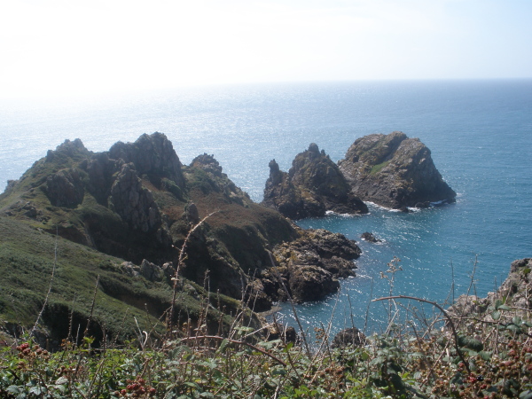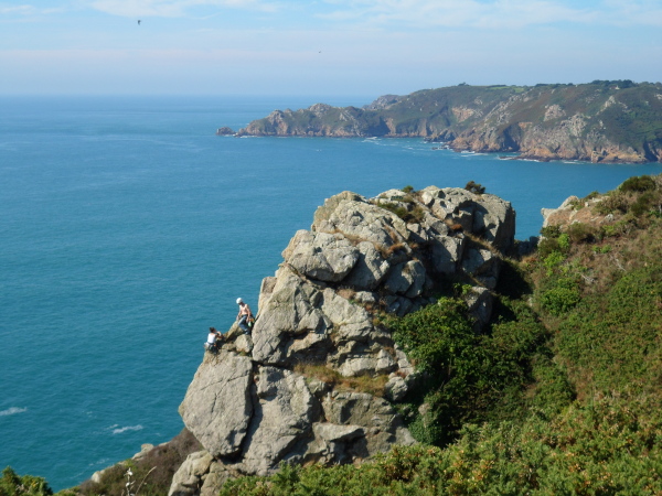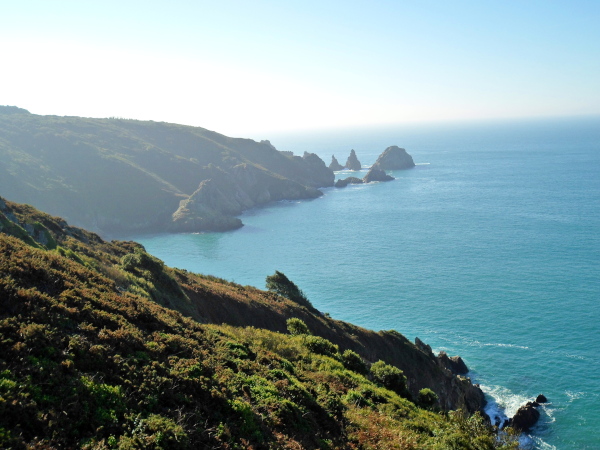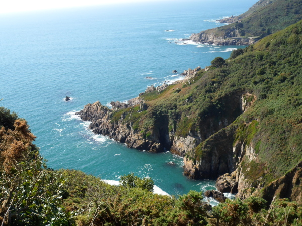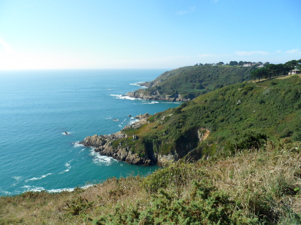Wir laufen weiter auf der Route de Pleinmont in Richtung Westküste. Dies ist der angenehmste Teil der Strecke: es geht abwärts. Nach 8,5 Meilen erreichen wir beim Hotel Imperial das Meer. Hier erwartet uns ein angenehmer frischer Seewind, der die Schwüle von vorhin vertreibt. Und auch die Sicht wird immer besser.