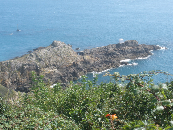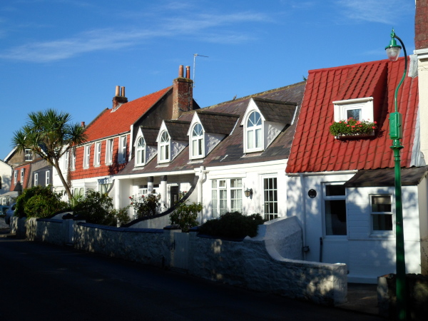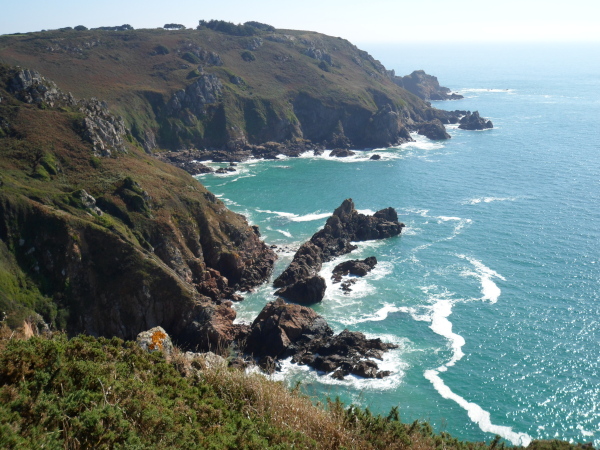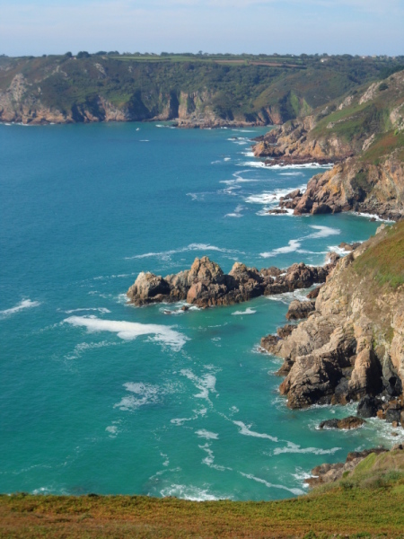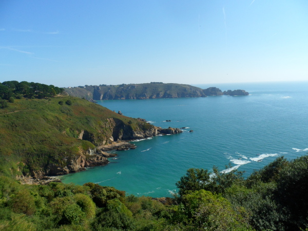 Wir biegen nach rechts ab und folgen der Route de la Lague in Richtung Norden. Die Strecke ist eben und führt uns stets nah der Küste entlang. Wir sehen die großen Sandstrände der Rocquaine Bay und der L’Eree Bay. Deutlich ist Lihou Island zu erkennen, bei Flut eine Insel, bei Ebbe ein Teil von Guernsey.