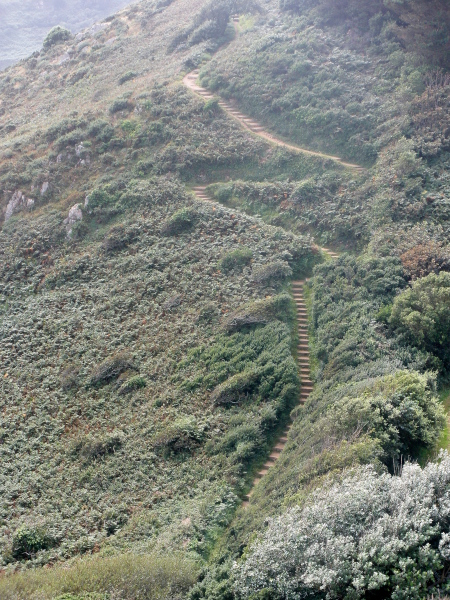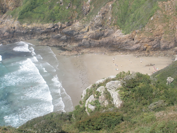 Ich bin schon einige Tage vor dem Marathon angereist, um im Südosten und Süden der Insel auf den knapp 46km Klippenpfaden zu wandern. Die Pfade sind aufgrund der zahllosen Treppenstufen anstrengend, man wird aber immer wieder belohnt durch atemberaubende Ausblicke und super Buchten, deren Sandstrände allerdings nur bei Ebbe zum Vorschein treten. Hier ist der Sand dann durch einen der weltweit höchsten Gezeitenunterschiede so festgepresst, wie ich es noch nie anderswo erlebt habe. Und durch ihre teils schwere Erreichbarkeit – z.B. 270 Stufen steil hinunter zu Le Petit Port oder nur über eine Leiter zu Le Joannet Bay – hat man die schönsten Strände oft ganz für sich allein. Wo findet man das sonst noch?!