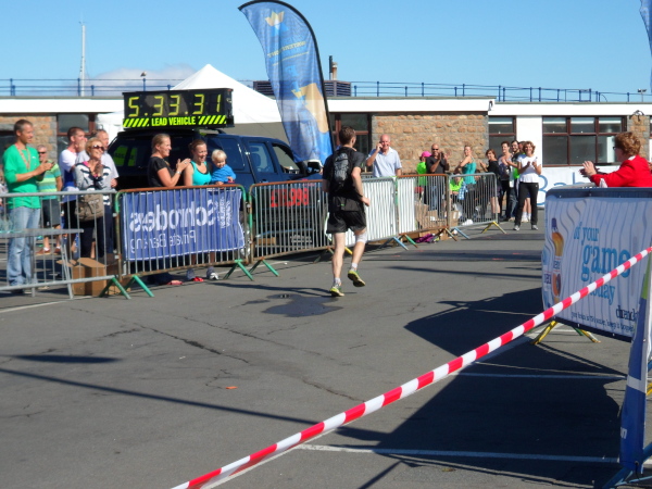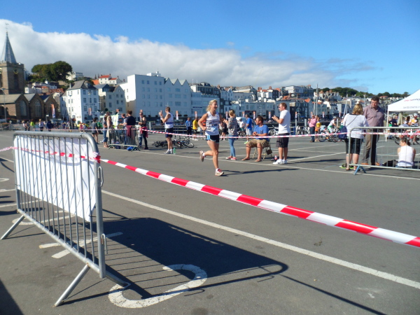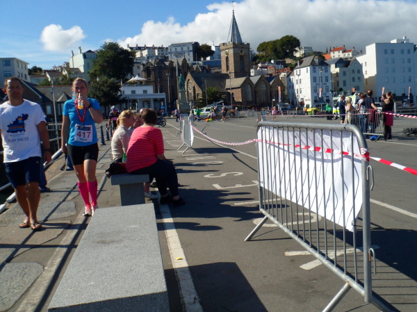 Ich gelange nach St. Peter Port und laufe vorbei am St. George’s, meiner Unterkunft. 500m weiter ist die Straße wieder für den Autoverkehr gesperrt. Die Strecke wird umsäumt von zahlreichen Zuschauern, die auch uns späten Läufern noch reichlich Beifall klatschen. Nicht alle von ihnen stehen hier für den Marathon, sondern z.T. sind sie gekommen wegen des anschließend an der gleichen Stelle stattfindenden Fahrrad-Rennens. Trotzdem spornen sie auch die Läufer kräftig an mit ihrem Applaus. 2 Rennveranstaltungen nacheinander am gleichen Tag am gleichen Ort auf teilweise gleicher Strecke, das sorgt für mehr Zuschauer, wovon letztendlich beide Veranstaltungen profitieren.