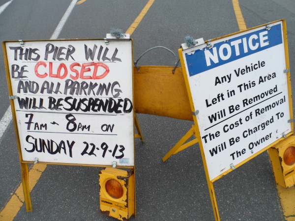 Im Hotel lerne ich beim Frühstück Sarah kennen, eine Engländerin, die hier ihren 2. Marathon laufen will (nach einem Marathon auf den Falkland-Inseln in 2012). Gemeinsam gehen wir zum Marathon-Village, wo wir 1 Stunde vor dem Start eintreffen. Außer uns sind so früh fast nur Helfer vor Ort, die meisten Läufer trudeln erst eine halbe Stunde nach uns ein. Ein Abschleppwagen schleppt vom Pier noch die letzten Wagen ab, die das schon vor Tagen aufgestellte Parkverbotsschild ignoriert haben. Aber parkende Autos auf der Zielgeraden – das geht gar nicht.