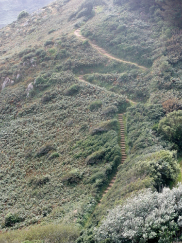 Kurz danach biegen wir links ab und nähern uns der Südküste. Normalerweise sollte uns hier eine phantastische Sicht auf die steilabfallende Küste und das Meer erwarten, aber heute wird sie verwehrt durch das diesige Wetter. Es ist neblig und schwül.