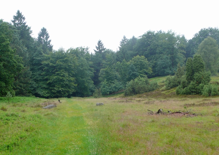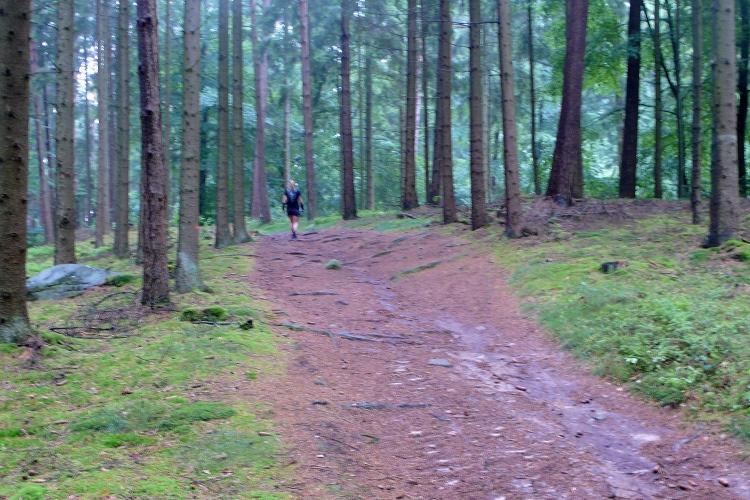 Diese Ruhe. Im Moor quaken Lurche und Frösche um die Wette, die finden das Wetter ganz toll. Aber nach dem Moor ist es vollkommen still. Die Vögel warten ab, den Niesel mögen sie nicht. Die Laufschuhe knirschen leise im Sand, das ist alles. Entspannung pur. Nach den glitschigen Bohlenwegen im Moor laufen wir auf mal breiten, mal schmalen Pfaden. Noch ist es flach bis wellig. Wegmarkierungen gibt es erstmal nicht. Dafür hat jeder eine Karte (wasserdicht verpackt!) , der GPS-Track funktioniert auch. Kurze Umwege kommen vor, sind aber nicht schlimm.