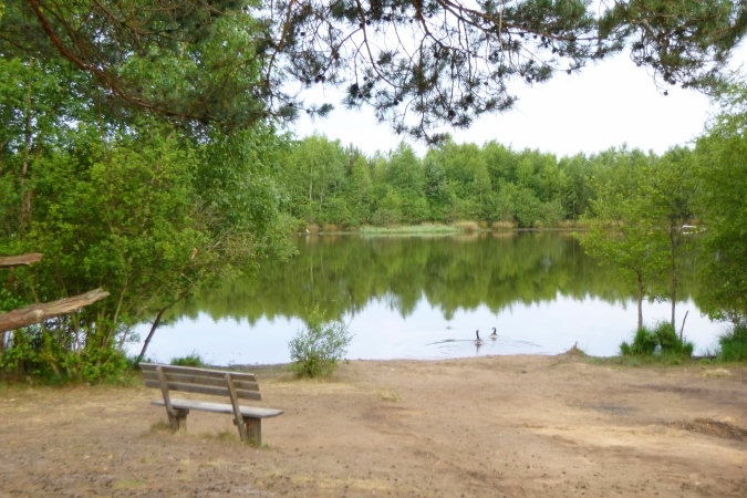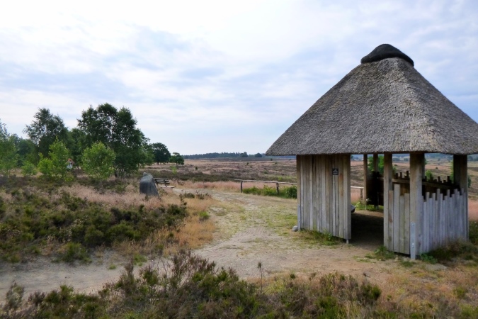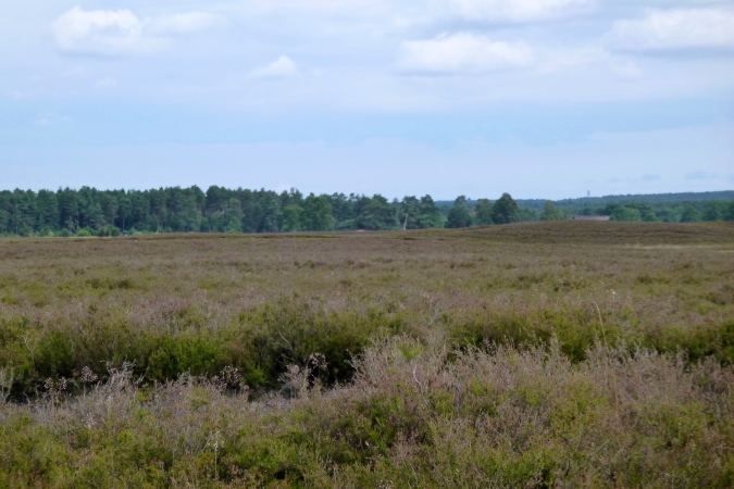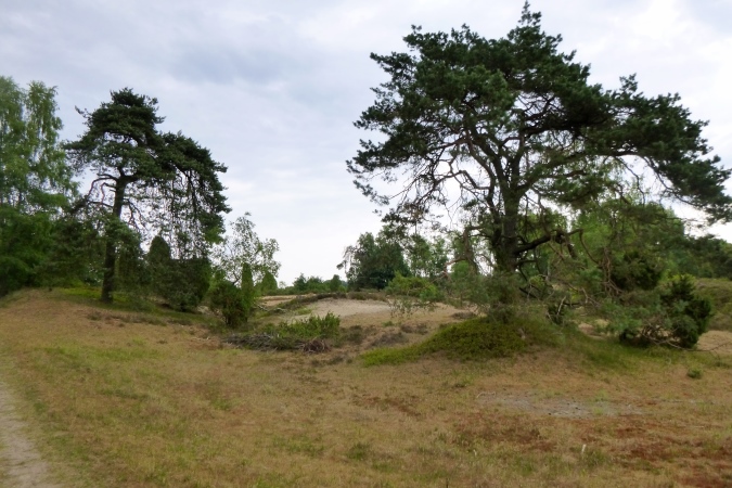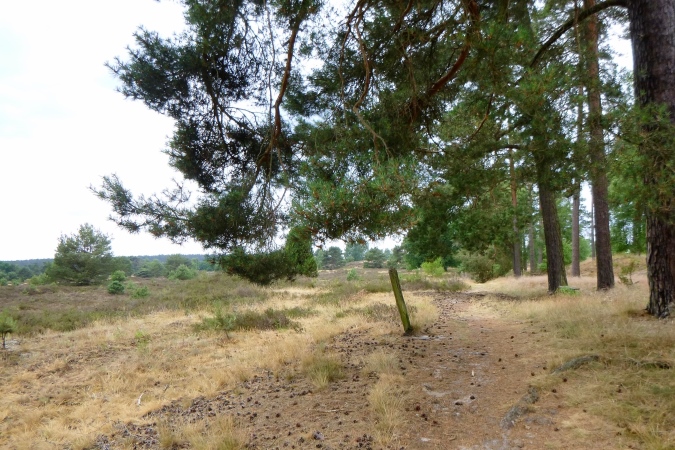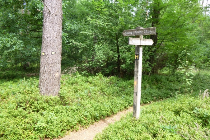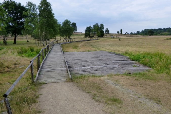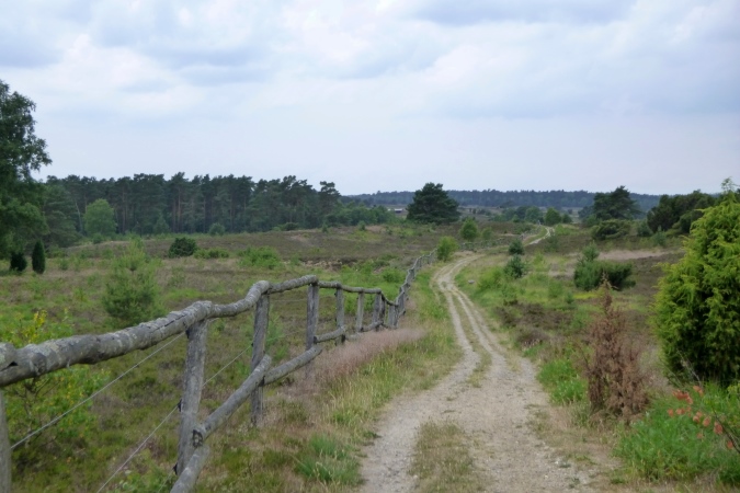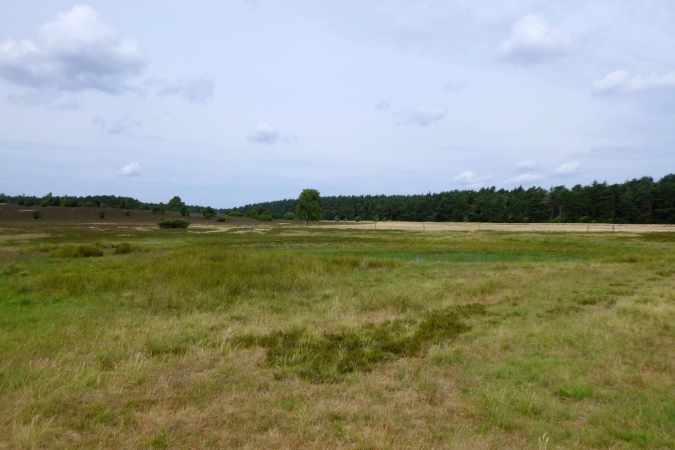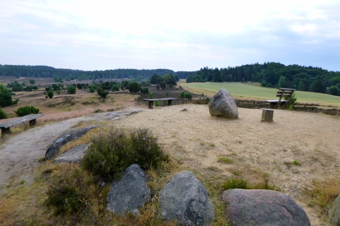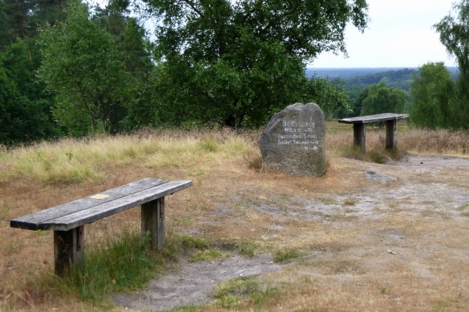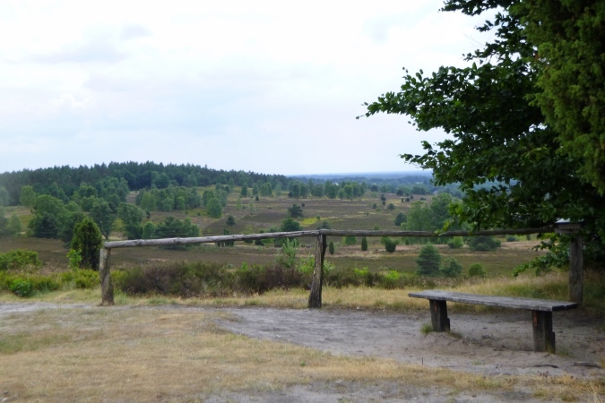 Hinter Undeloh, im Wald, wird es allmählich friedlich. Die letzten Lüneburger kommen vorbei und die Heide gehört mir wieder ganz allein. Vom Waldrand aus schweift der Blick auf die zentrale Heide rund um Wilsede. Irgendwo da sind wir vorhin durch (naja, ist ein paar Stunden her). Fiese Wurzeln lauern am Boden. Ein paar geknickte Bäume liegen noch quer. Und nun kommt meine Dehydrierung voll durch: auf fast jeder Sitzbank gibt es Pause. Geht nicht anders. Ich habe Durst ohne Ende. Die Schorle im Trinksack schmeckt fad und hält nur 100 Meter. Hilft ja alles nix, es muss weitergehen. Erst auf Wilsede zu, aber knapp vorher rechts an einem Teich vorbei auf den Trail der Wilseder Berg hoch. Wieso sehe ich eigentlich dauernd so ein kaltes Glas bernsteinfarbenes Hefeweizen vor mir, wo außen das Kondenswasser abperlt und eine kleine Schaumkrone ... nix da, wieder nur ein Traum.