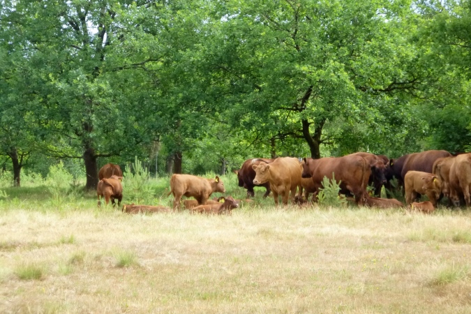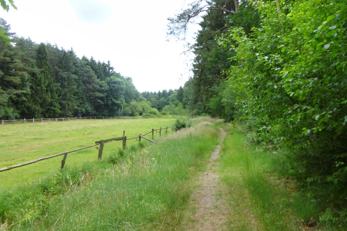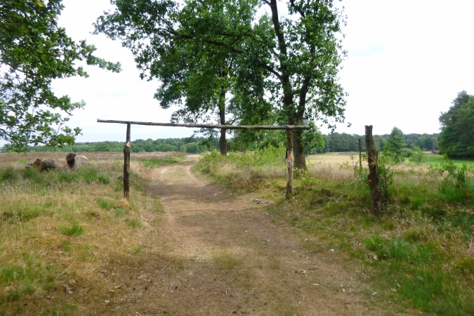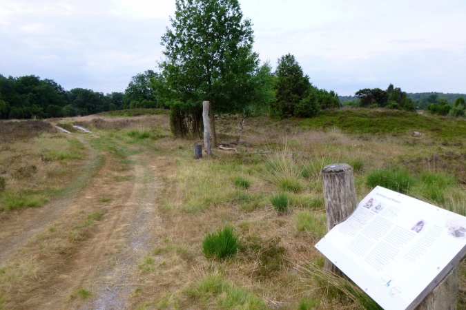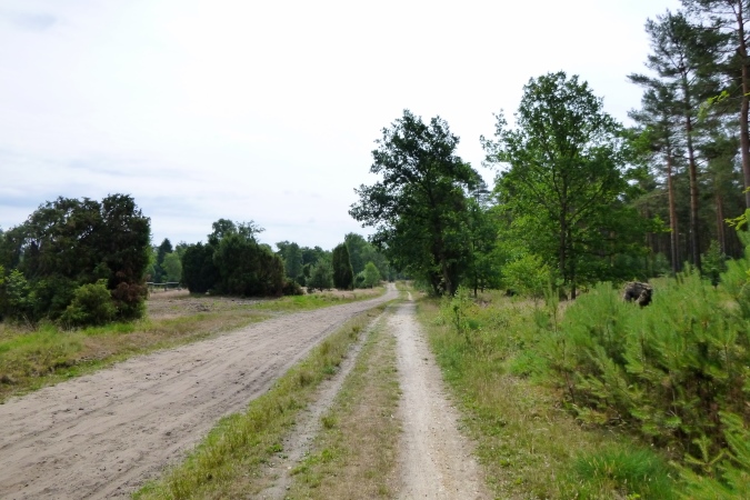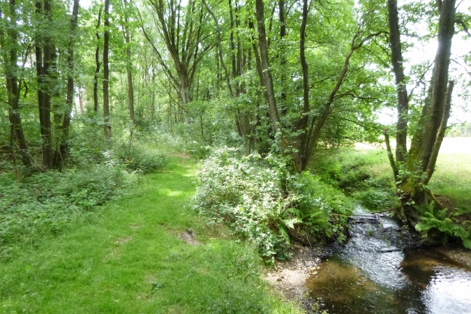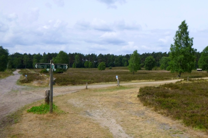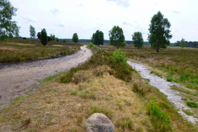 Der Pastor-Bode-Weg bringt uns wieder in die Heide Richtung Döhle, auf Sand und Schotter. Und trocken. Staubtrocken ist es. Meine Trinkblase leert sich schnell. Die Hörpeler Heide will noch umrundet werden, dann kommt ein Bach, mit klarem, kaltem Wasser! Das schmeckt zwar nicht, kühlt einen aber gut runter. Leider treffen wir nur an der Brücke auf den Bach, später nicht mehr. Schade drum.