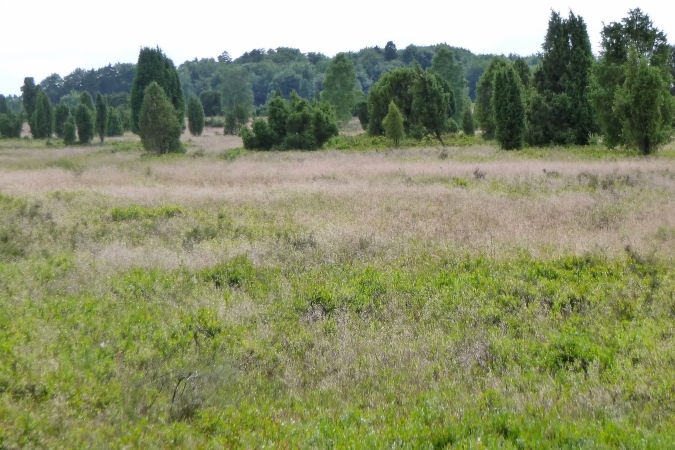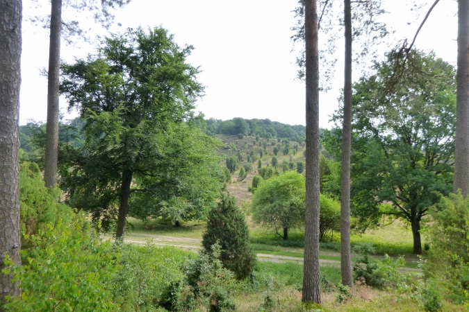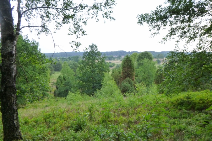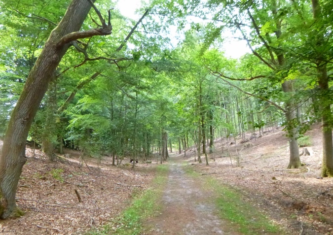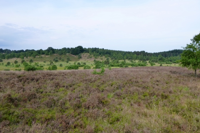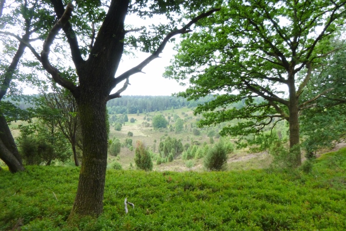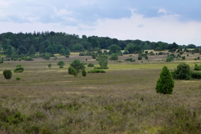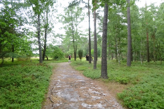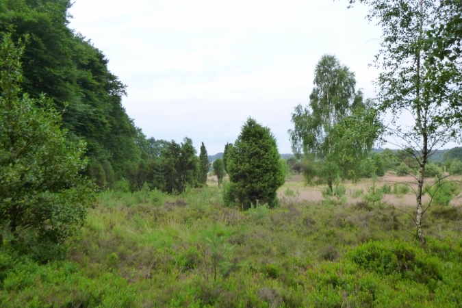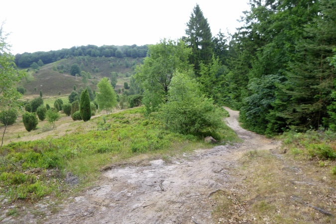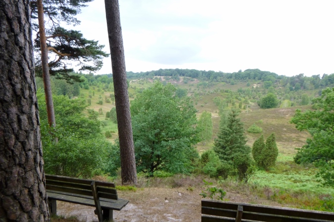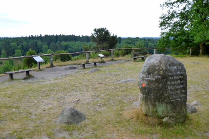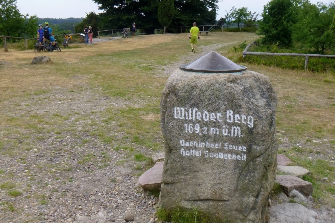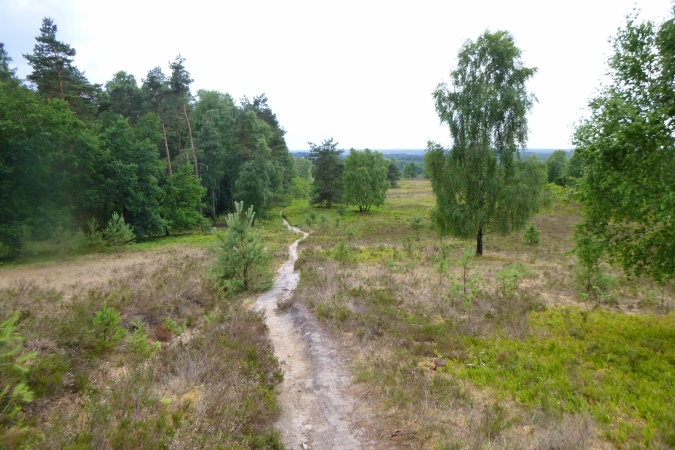 Nach dem Regenschauer sind die Wanderer selten geworden. Nur wenige begegnen mir oben auf dem Gipfel. Immer noch prächtige Fernsicht nach allen Seiten aus 165 m Höhe. Noch höher geht es nicht, also runter auf steilem Abhang mit vielen losen Steinen. Unten scharf links und gleich wieder hoch. Diesmal auf 160 m, der zweithöchste Berg. Dann, endlich, nur noch runter nach Oberhaverbeck - Parkplatz, zu Petra.