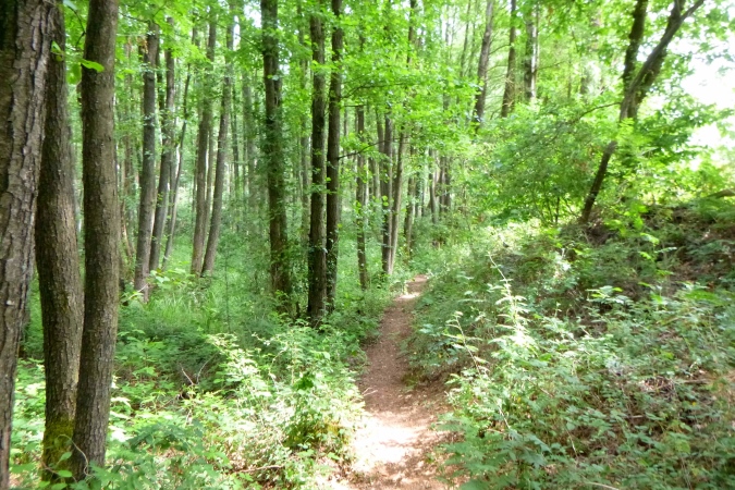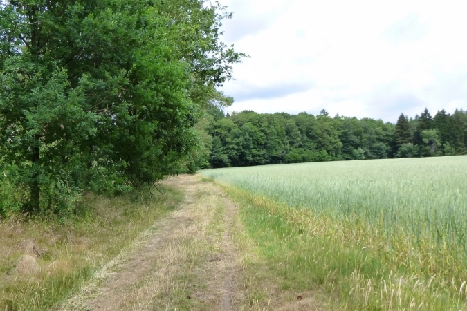 Hinter Döhle beginnt das Bergland. Wilde Täler, schroffe Höhen, finsterer Wald. Stille. Ringsum kein Ton zu hören, auch die Vögel sind still. Ob da ein Unwetter heraufzieht? Nur das eigene Hecheln ist zu hören, steil und endlos die Berge hoch. Wir laufen Richtung Egestorf, aber vorher links dran vorbei. Den Ort sieht man eigentlich nicht, nur einen Baukran in der Ferne. Sudermühlen mit dem VP liegt auf 43 km. Tatsächlich - ein kurzer Regenschauer kommt runter, als ich unter der Markise sitze und mich versorge. Nun wird‘s schwül, feucht, drückend.